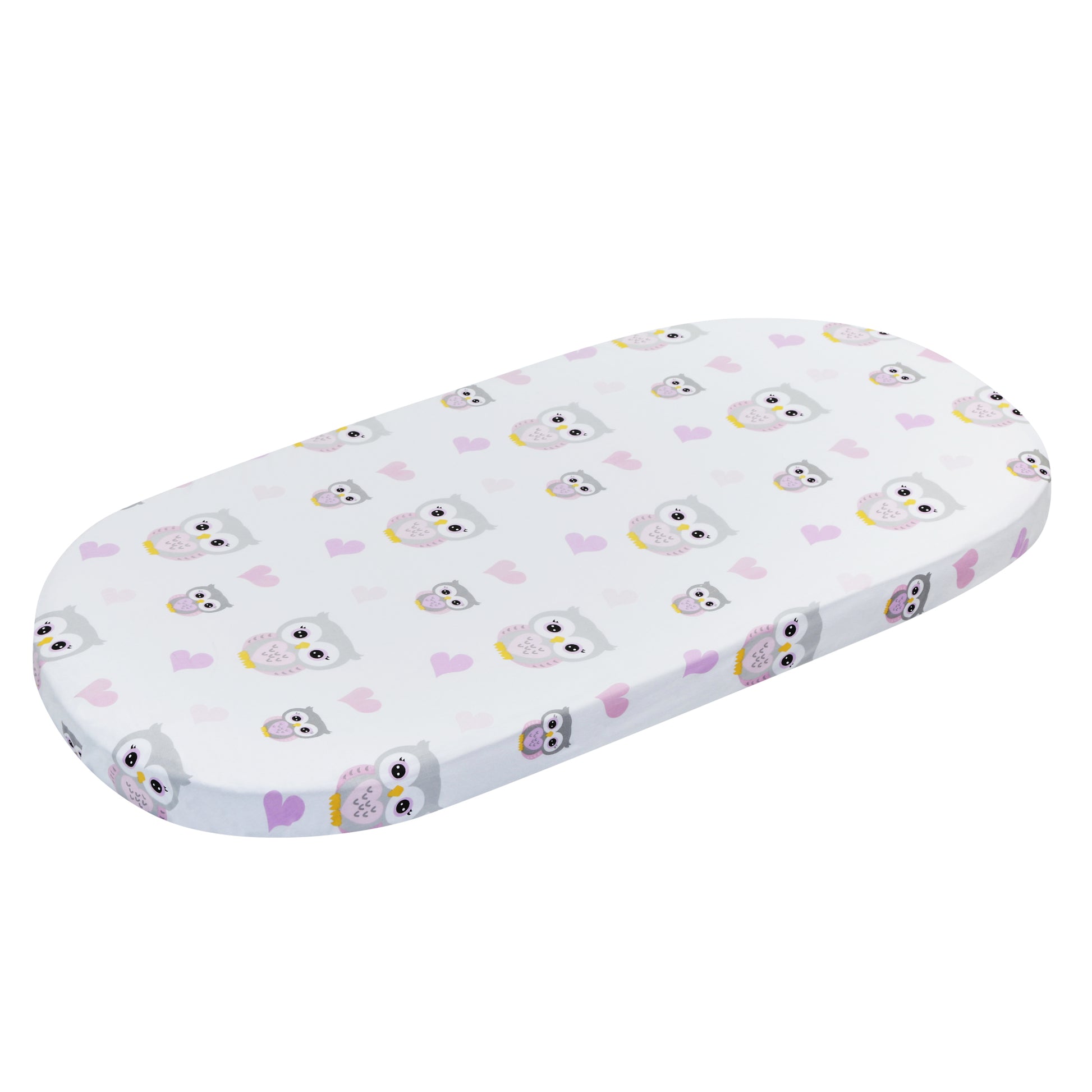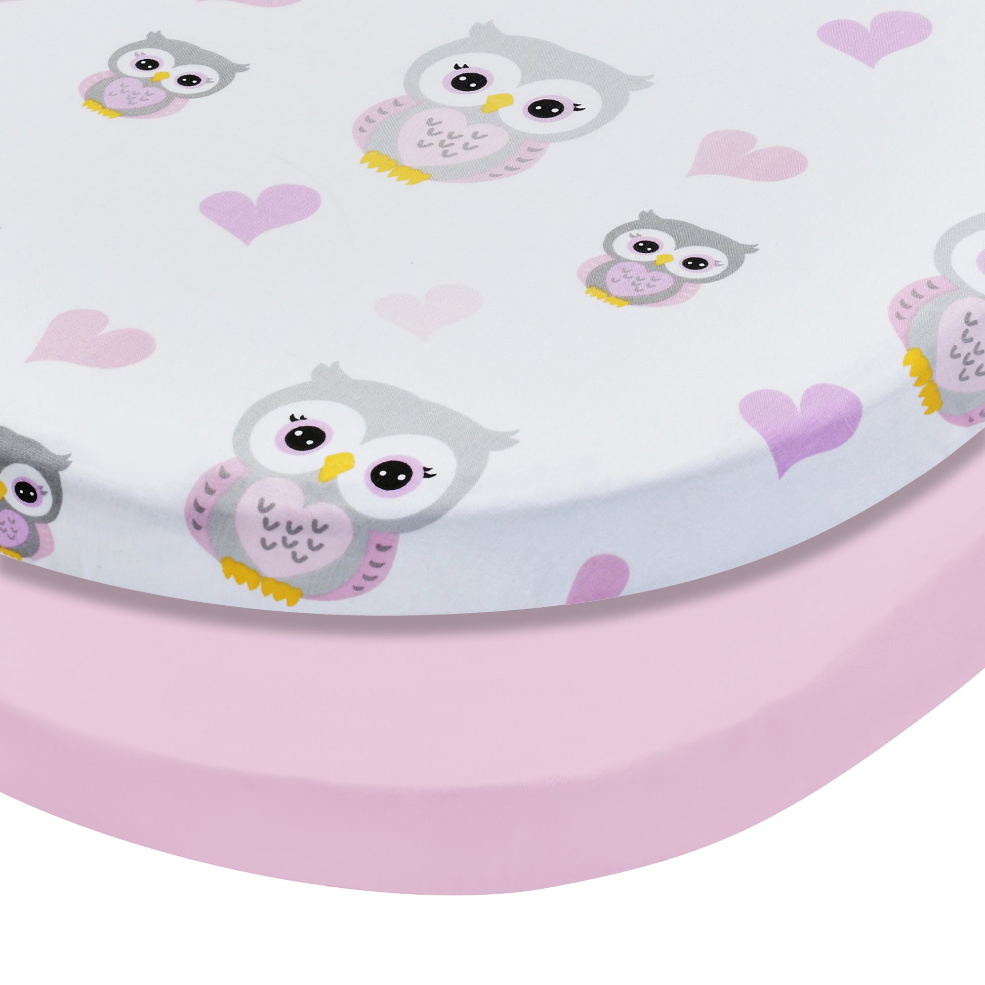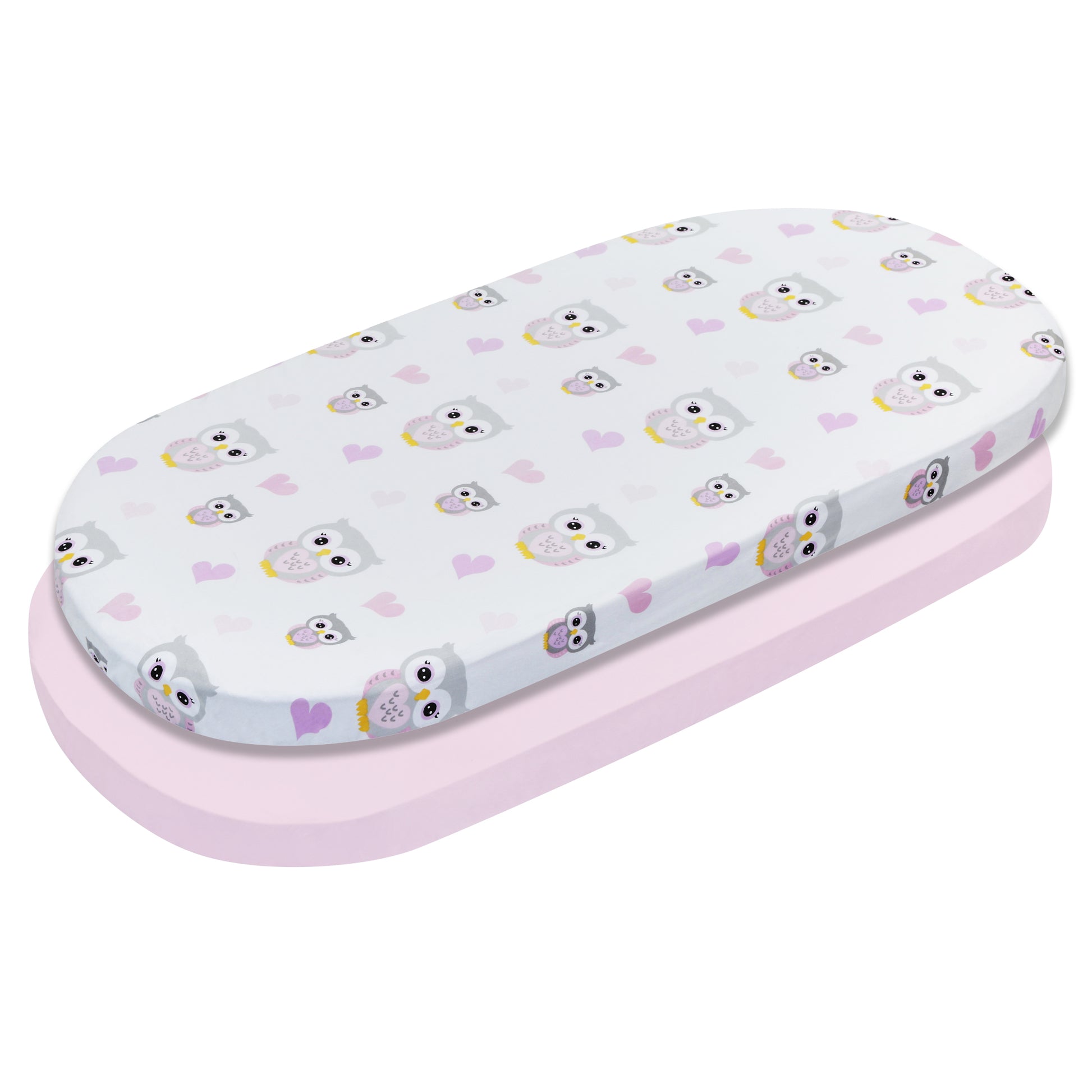 Our bassinet sheets are designed to fit almost every bassinet mattress pad! It completely surrounds the rounded edges of the oval shaped pad and lies smooth. Each sheet is fitted and measures 16" by 32" with a 4" deep pocket. With the fun images of gray mommy & baby owls with pink hearts on a white background on one sheet and a solid pink color on the other, you’ll love how it complements your baby’s layette.