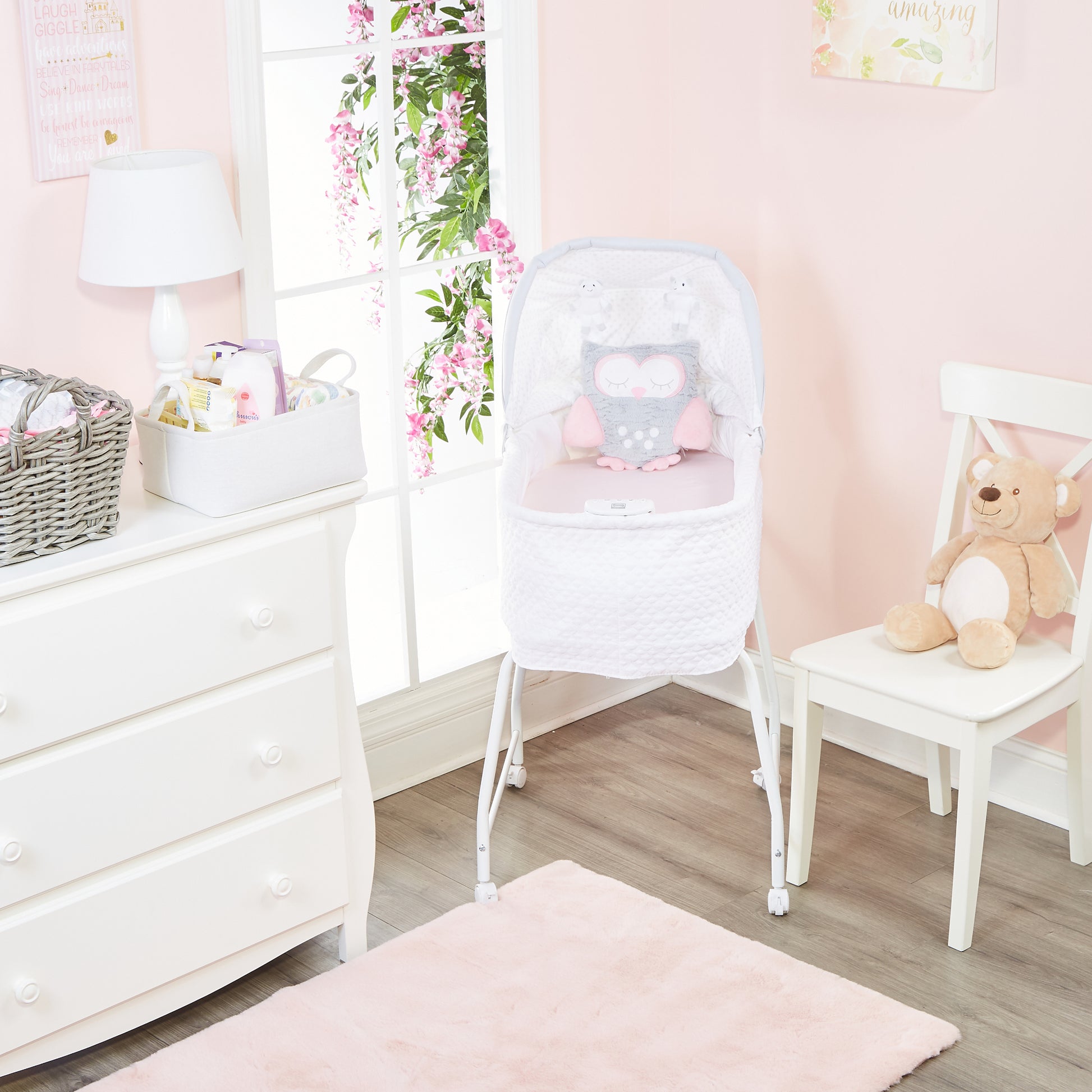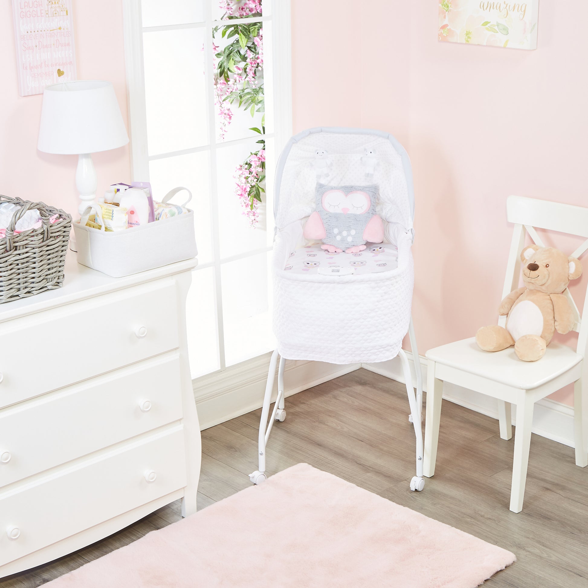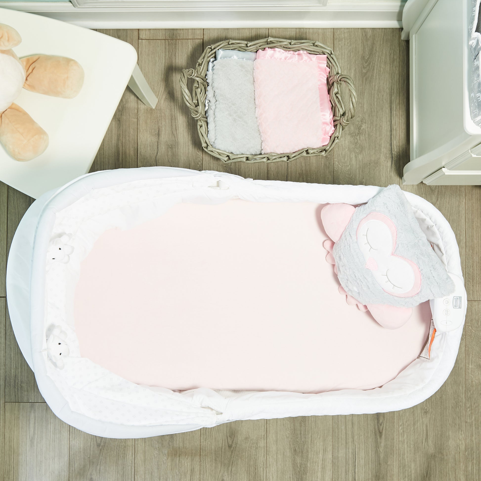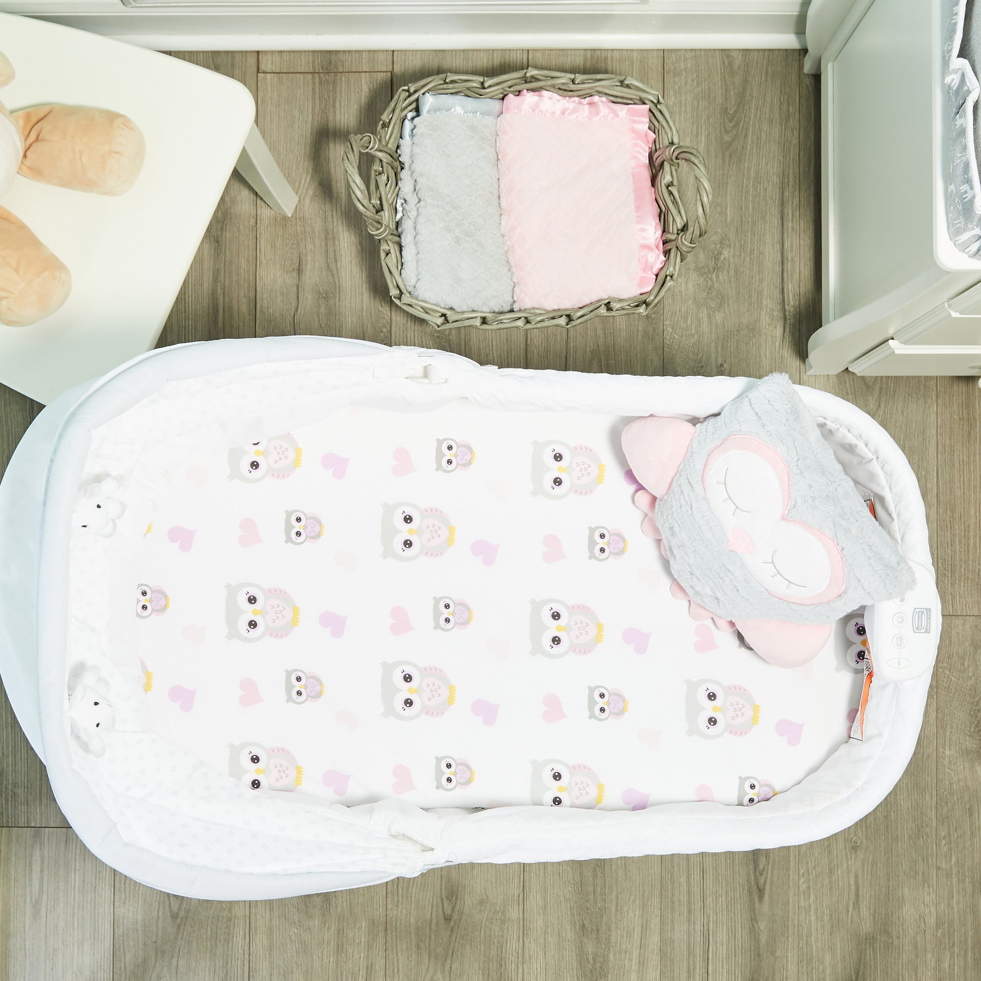 Our bassinet sheets are designed to fit almost every bassinet mattress pad! It completely surrounds the rounded edges of the oval shaped pad and lies smooth. Each sheet is fitted and measures 16" by 32" with a 4" deep pocket. With the fun images of gray mommy & baby owls with pink hearts on a white background on one sheet and a solid pink color on the other, you’ll love how it complements your baby’s layette.