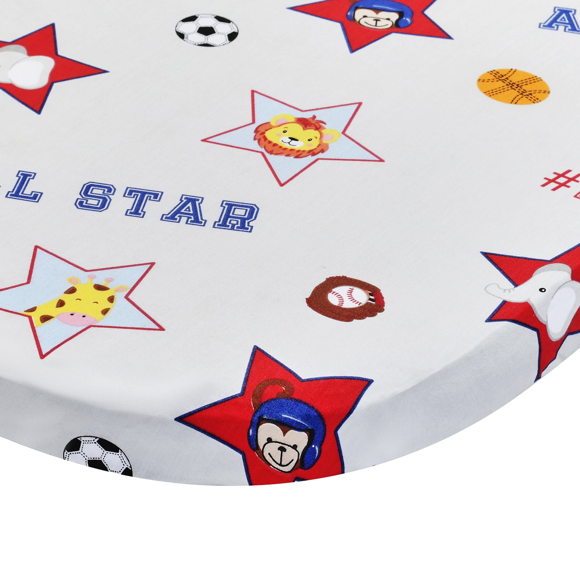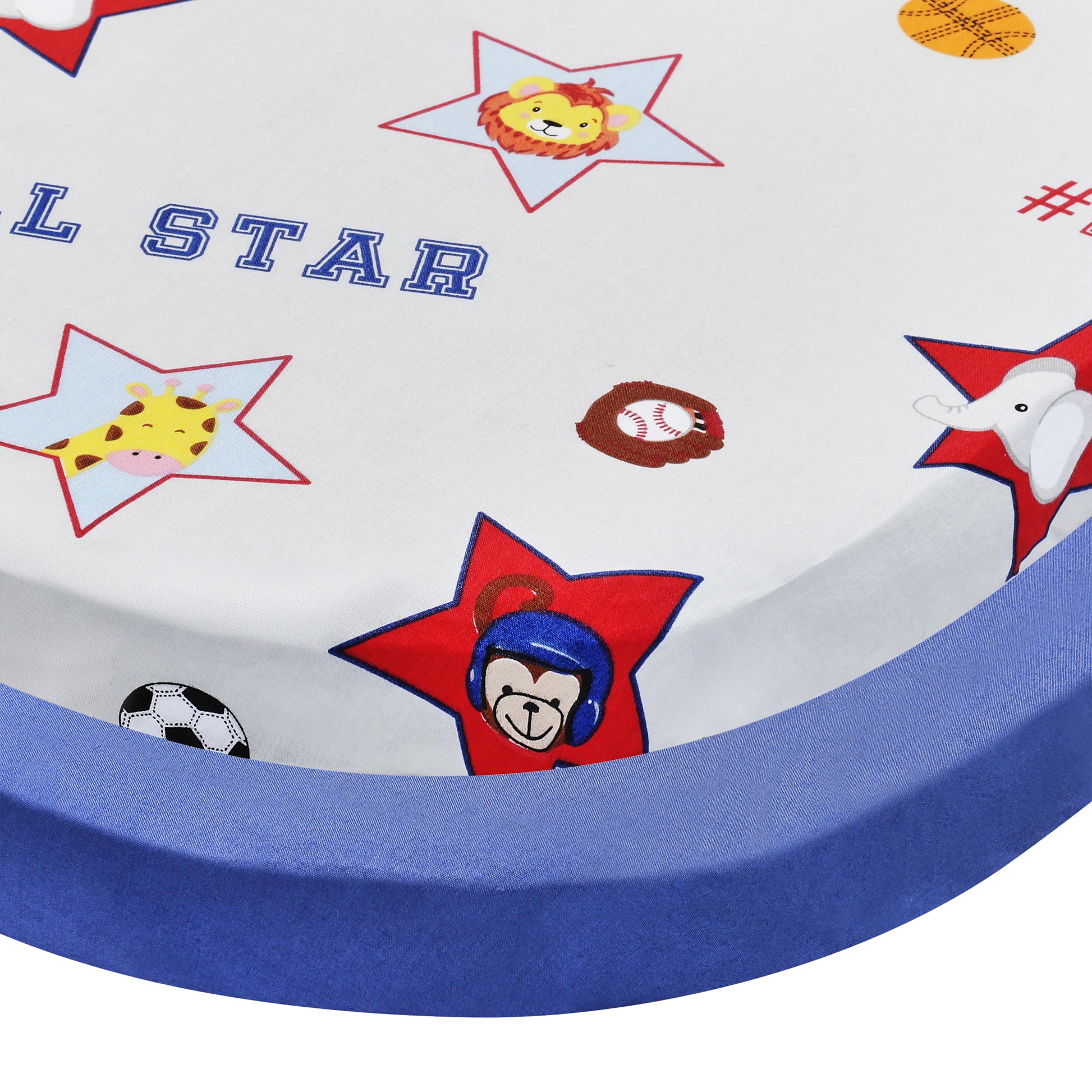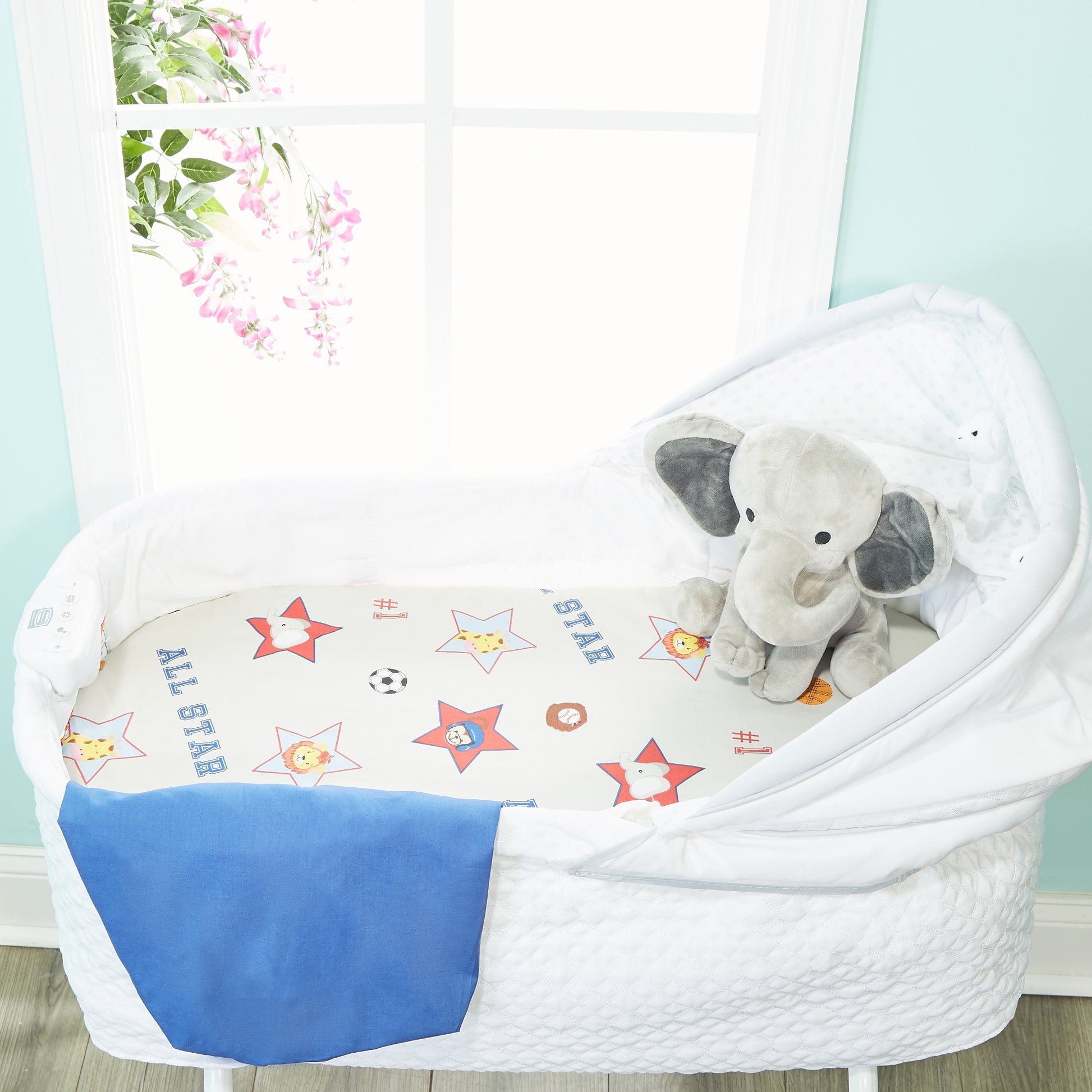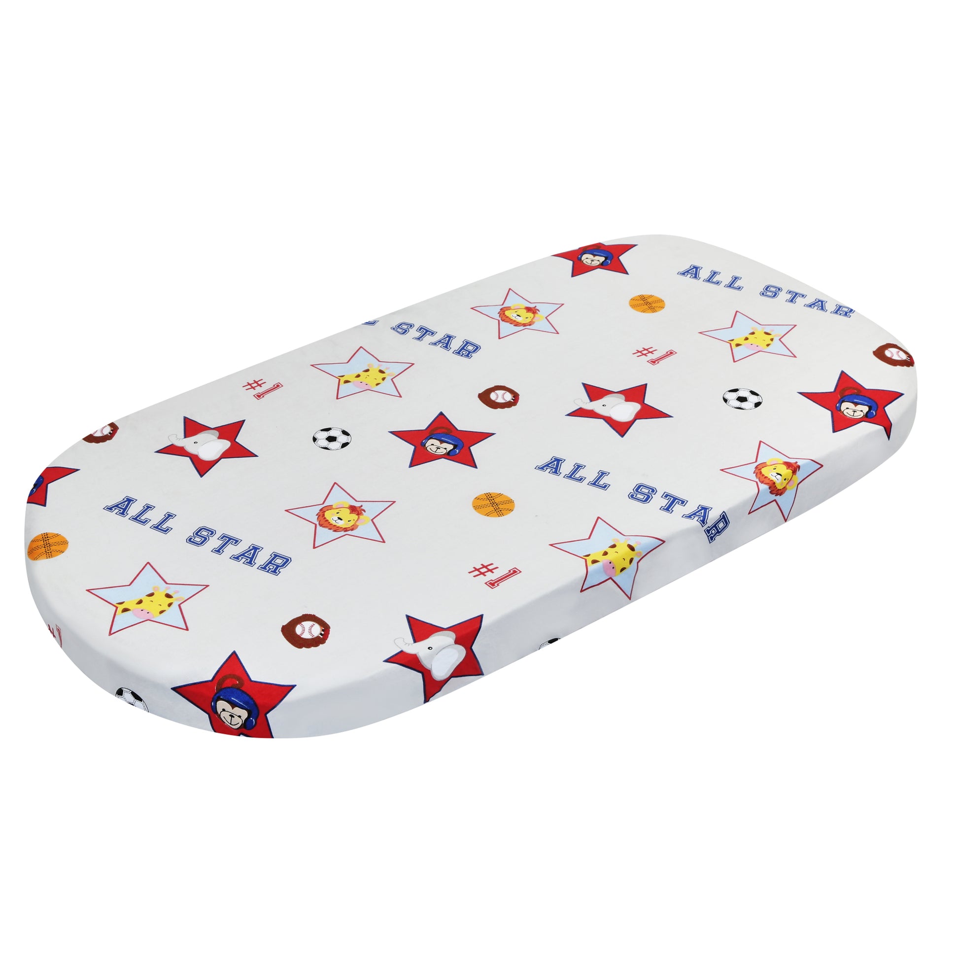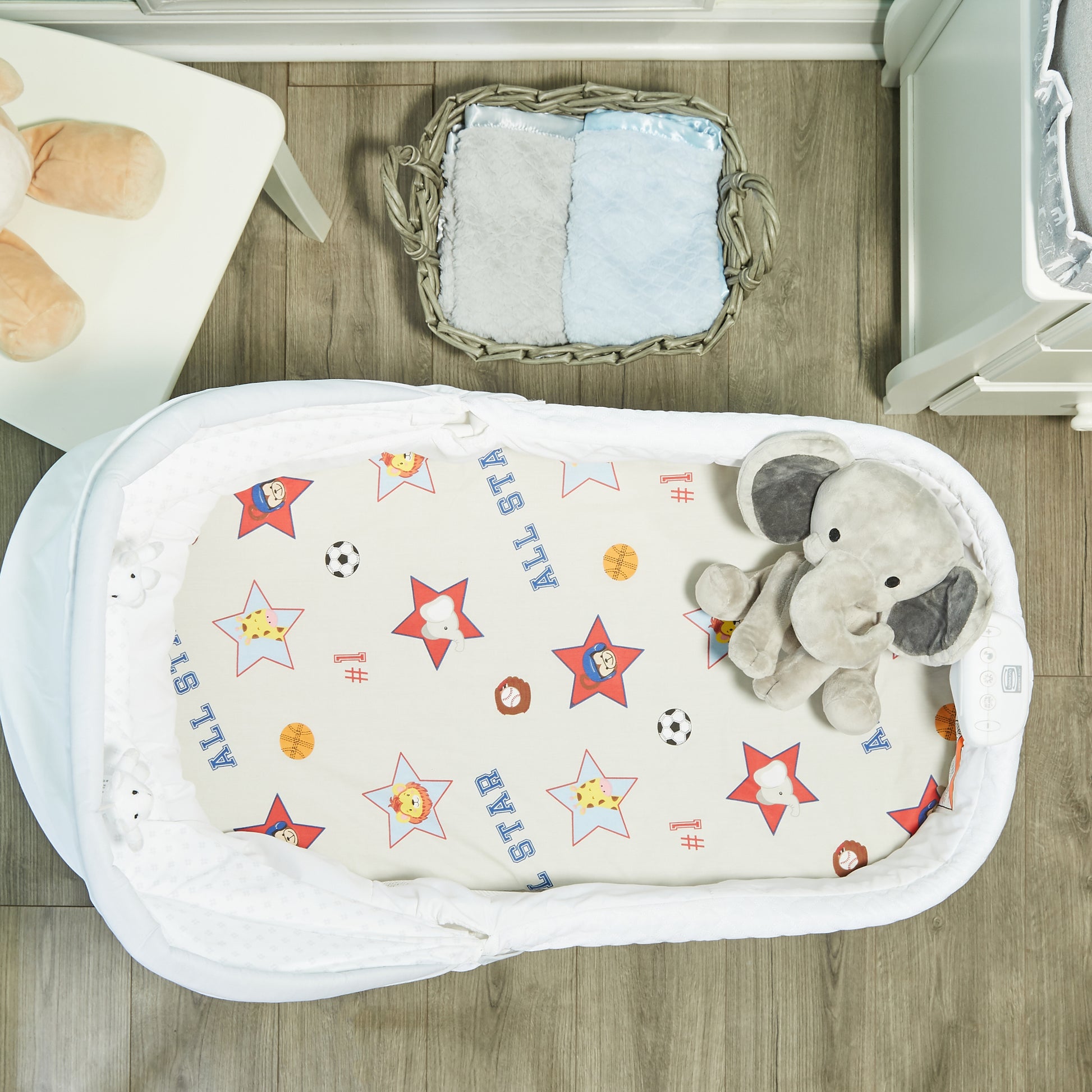 Our bassinet sheets are designed to fit almost every bassinet mattress pad! It completely surrounds the rounded edges of the oval shaped pad and lies smooth. Each sheet is fitted and measures 16" by 32" with a 4" deep pocket. With the fun images of cute jungle animal faces and various sports icons on a white background on one sheet and a solid blue color on the other, you’ll love how it complements your baby’s layette.