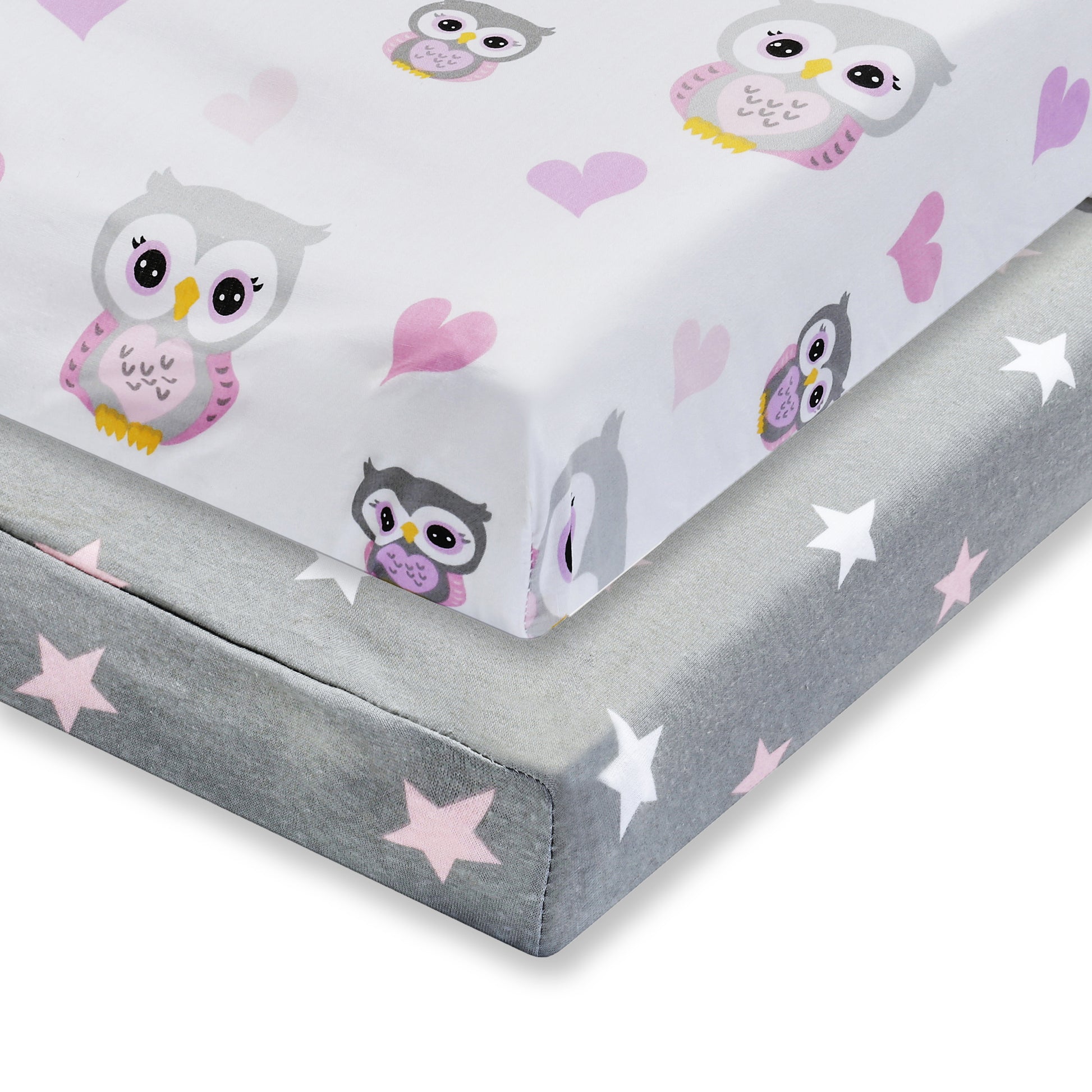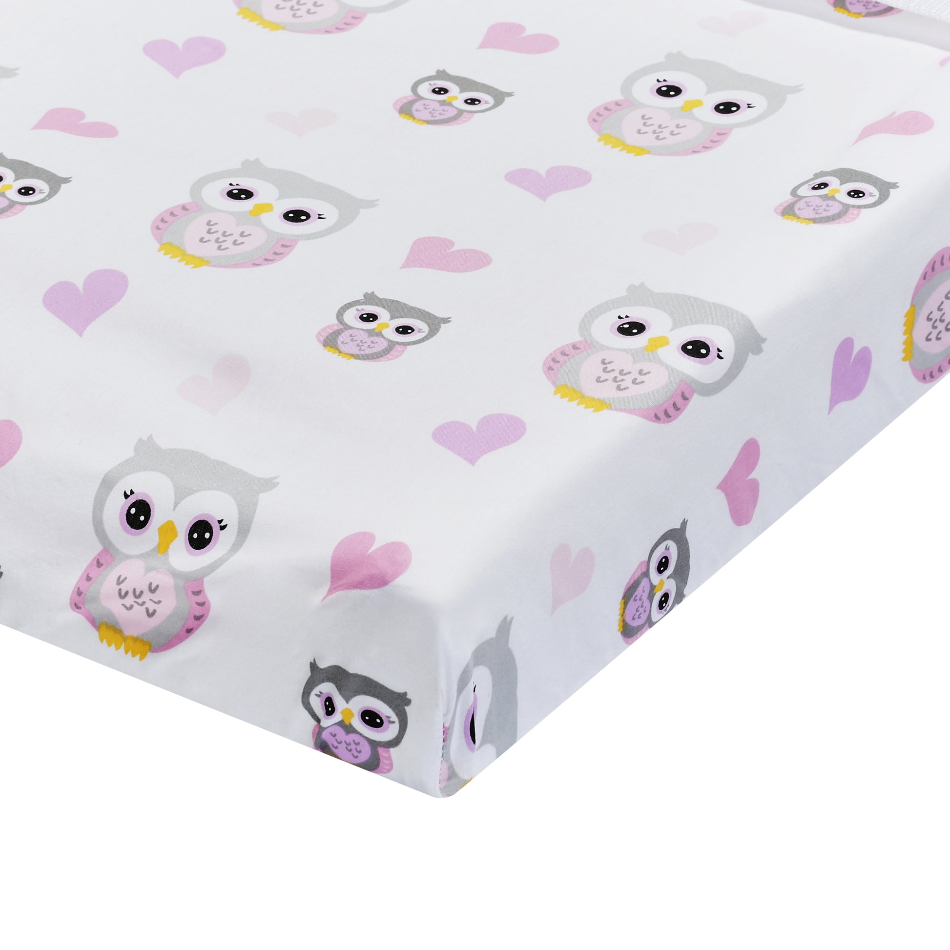 SET OF 2 CUTE CHANGING TABLE COVERS: In shades of pastel pink and white, this pretty pad cover set includes two sheets: one is white and designed with sweet owls and pink and purple hearts and the other is dark gray with pink and white stars! It’s a wonderful addition to nurseries for baby girls!