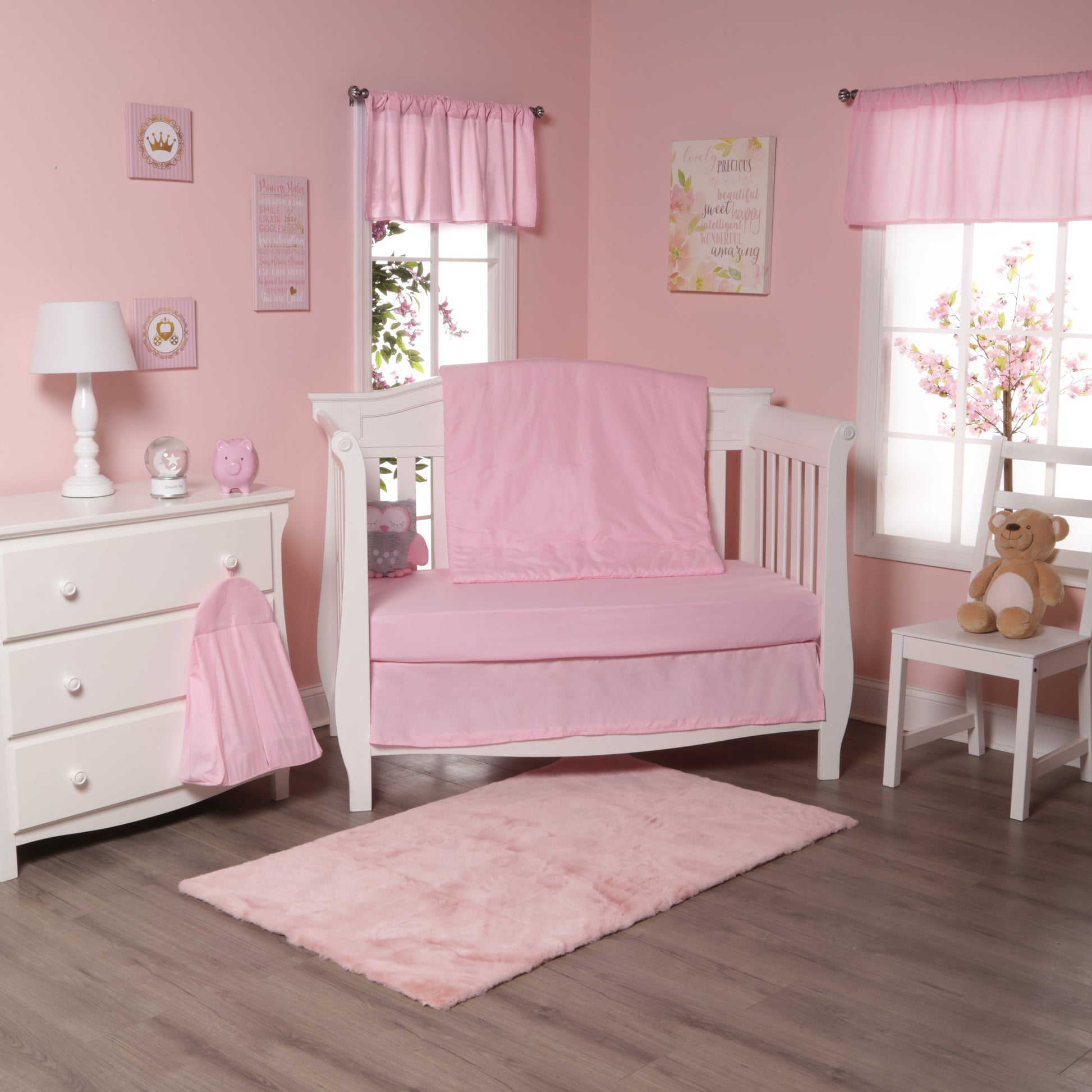 - DECORATE HER ROOM WITH PINK BABY ACCESSORIES: At Everyday Kids, we delight in creating bedding and decorations that make children happy. The pieces in this set are designed to add just the right touch of soft color to compliment any theme or decorations. See our selections from cartoon characters to icons kids love for inspiration.