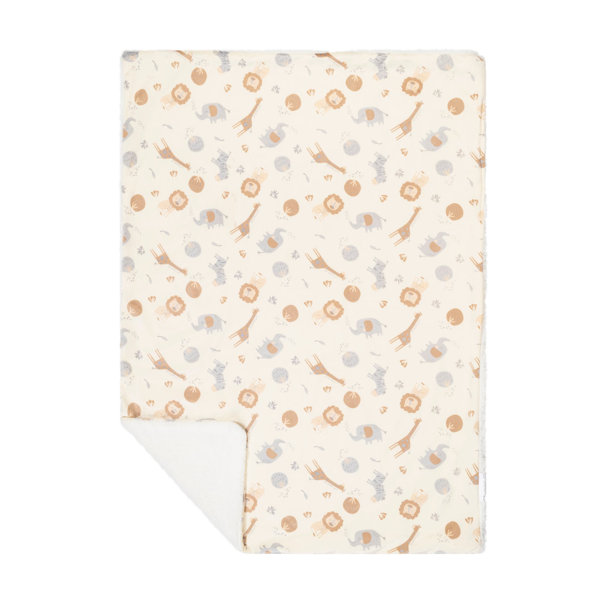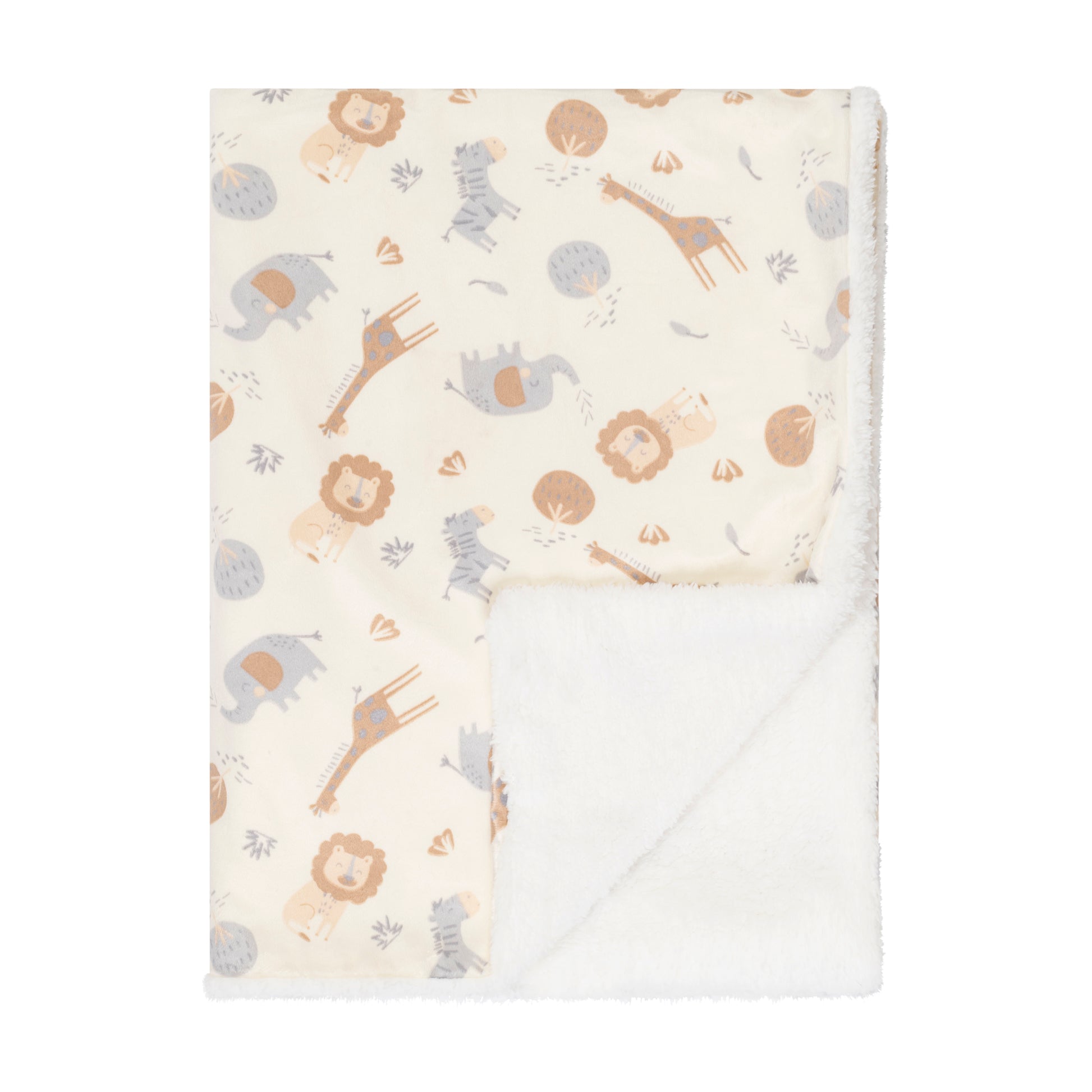 - OH-SO-CUTE AND SOFT CRIB BLANKET FOR A BABY GIRL OR BOY: This white baby blanket designed with grey elephants and zebras and brown lions and giraffes is luxuriously soft with a micro mink front and sherpa backing. Wonderful for cuddling while rocking and during storytime.