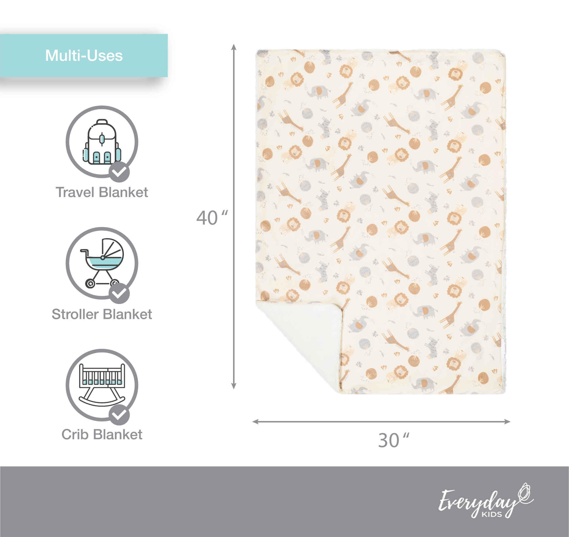 - MODERN WILDLIFE BABY NURSERY DECOR: Measuring 30 x 40 inches, it’s size works great as a stroller blanket and baby boy nursery bedding. You’ll love this baby crib blanket that transitions to a baby travel blanket! Wonderful Swaddle Blanket: Give him a feeling of security as you bundle him in this nursery swaddling blanket. With its warm and soothing sherpa lining, he’ll fall to sleep within moments.