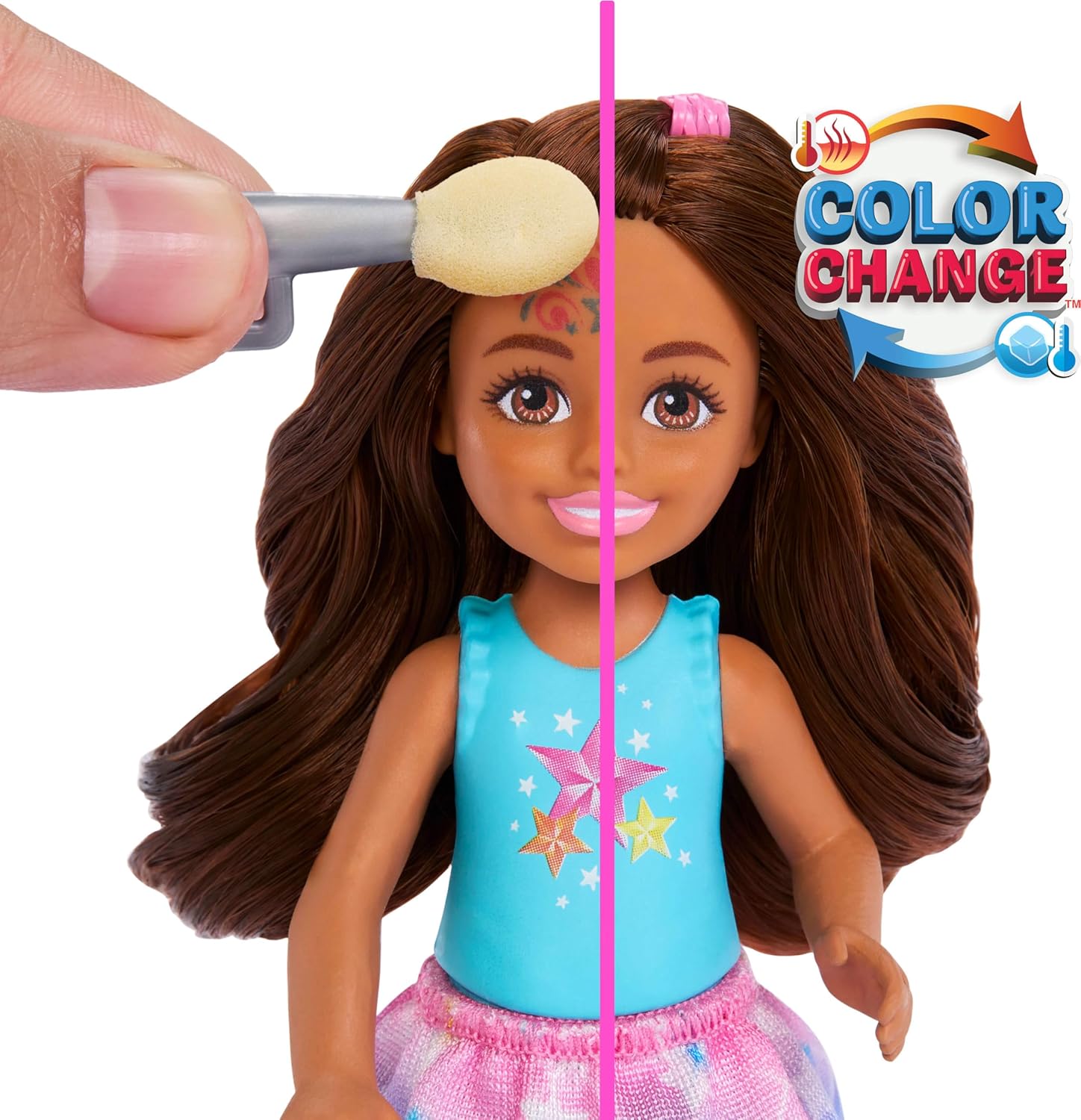Bring carnival fun home with the Barbie Day at the Fair Playset featuring Barbie and Chelsea dolls. This interactive set includes face painting, photo booth play, and magical costume accessories for endless storytelling. Kids can use cold water to reveal color-changing face designs on Chelsea, pose her in the photo frame, and dress her with fairy wings and a unicorn headband. The pink cabin folds into a suitcase for easy storage and on-the-go play.
