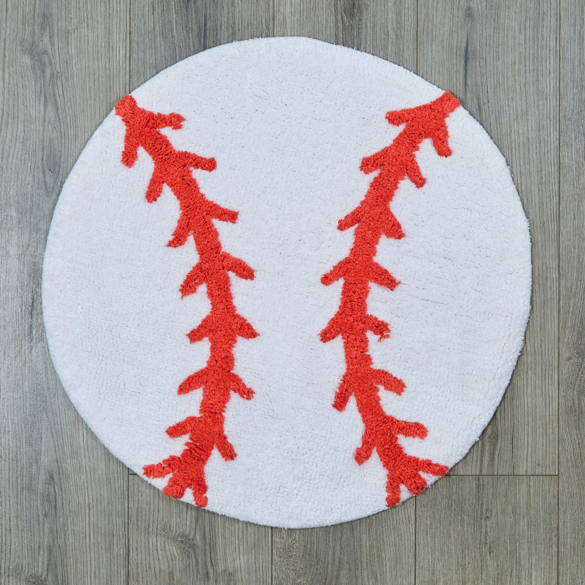 - COLORFUL AND IMAGINATIVE: In classic colors of white and red, this awesome rug features the standard round shape of a baseball. Create a fun and sporty atmosphere of creative play he’ll enjoy! Use it as a cute kids bath mat or aesthetic rug for play areas!