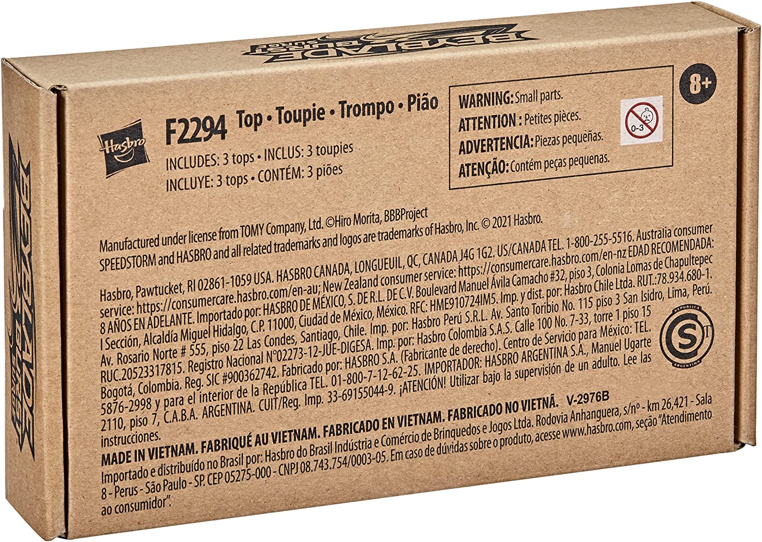 Supercharge the battle strategy with official Beyblade Burst Speedstorm tops by Hasbro! Speedstorm spinning tops are designed to harness the power of the inescapable Power Vortex: an energy zone at the center of the Speedstorm Beystadium designed to pull tops in and give them the ultimate speed boost. (Speedstorm Beystadium sold separately. Subject to availability.) Conquer the storm and master the clash. Tempest Cloud 3-Pack includes 3 competitive battling tops: Abyss Devolos D6 D54 TSP01 balance top, Demise Satomb S6 D15 TSP05-M attack top (features metal on the Performance Tip,) and Mirage Helios H6 D81 TSP08 stamina top (features rubber power absorption.) Each top has a Storm Chip component. Compete in a Speedstorm Beystadium to master the power of the storm! Requires Beyblade Burst Speedstorm Beystadium and launchers for Beyblade Burst battle games. (Each sold separately. Subject to availability.) Hasbro and all related terms are trademarks of Hasbro.
