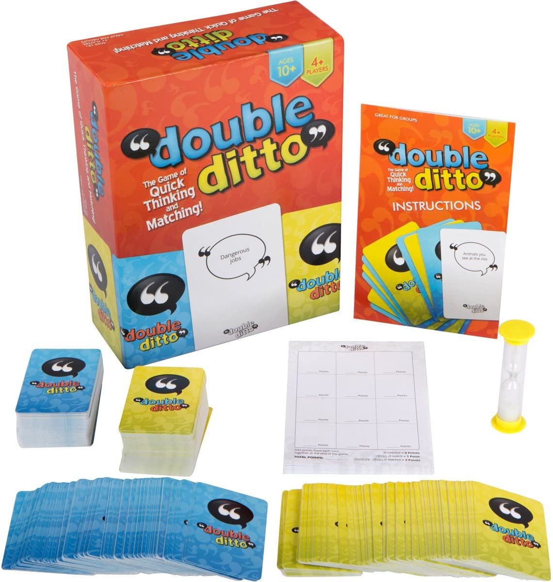 - INCLUDES: 400 category cards, a 15-second timer, score sheets, and instruction card. Ages: 10+; Players: 4 - 10 or more; Play Time: 25 minutes. (**8 and 9-year-olds with strong reading and writing skills may also enjoy playing, and younger players may "team up" with an adult.) Double Ditto is a popular board game for kids, families, teens and adults.)