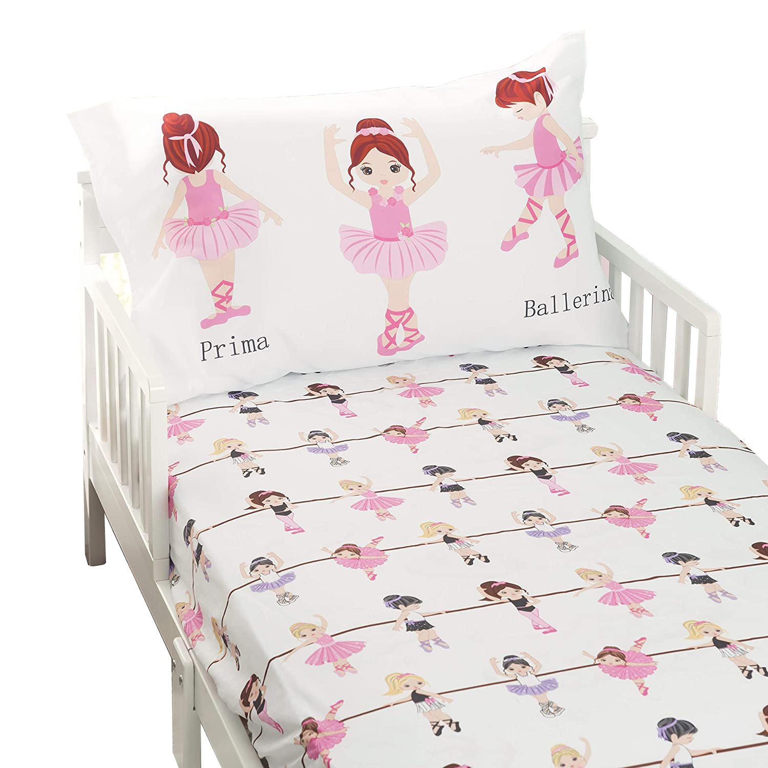 Inspire the budding ballerina in your life with the adorable Everyday Kids Toddler Fitted Sheet Pillowcase Set in Born to Dance Ballerina. This girls toddler sheets set shows girls in glittery skirts and leotards doing several ballet poses. The pillowcase shows different labeled ballet positions, making it both cute and interactive. The lovely illustrations on this ballerina toddler sheets set helps keep your daughter’s mind engaged as she lies in bed. A few poses before bed or after waking up gets small girls into the habit of being active, preparing them for exercise as they get older.