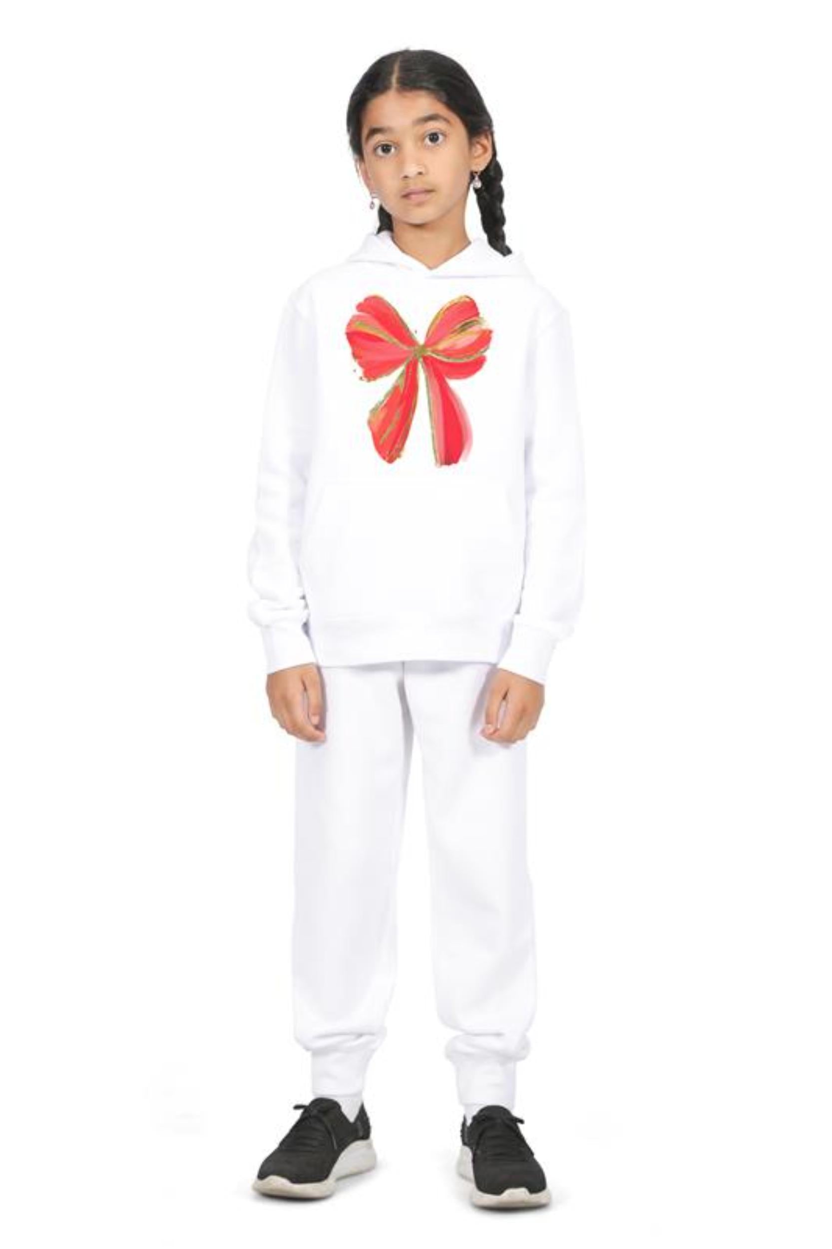 Everyday Kids Christmas Collection Festive Red & Gold Bow Girls Pullover Hoodie – Holiday Sweatshirt - White