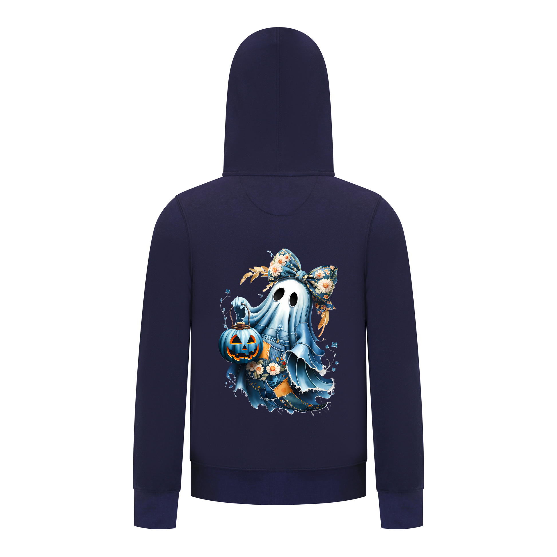 ADORABLY SPOOKY DESIGN – Features a charming ghost in denim-inspired patches with a big floral bow, carrying a glowing pumpkin lantern—perfectly balancing cute and spooky vibes.