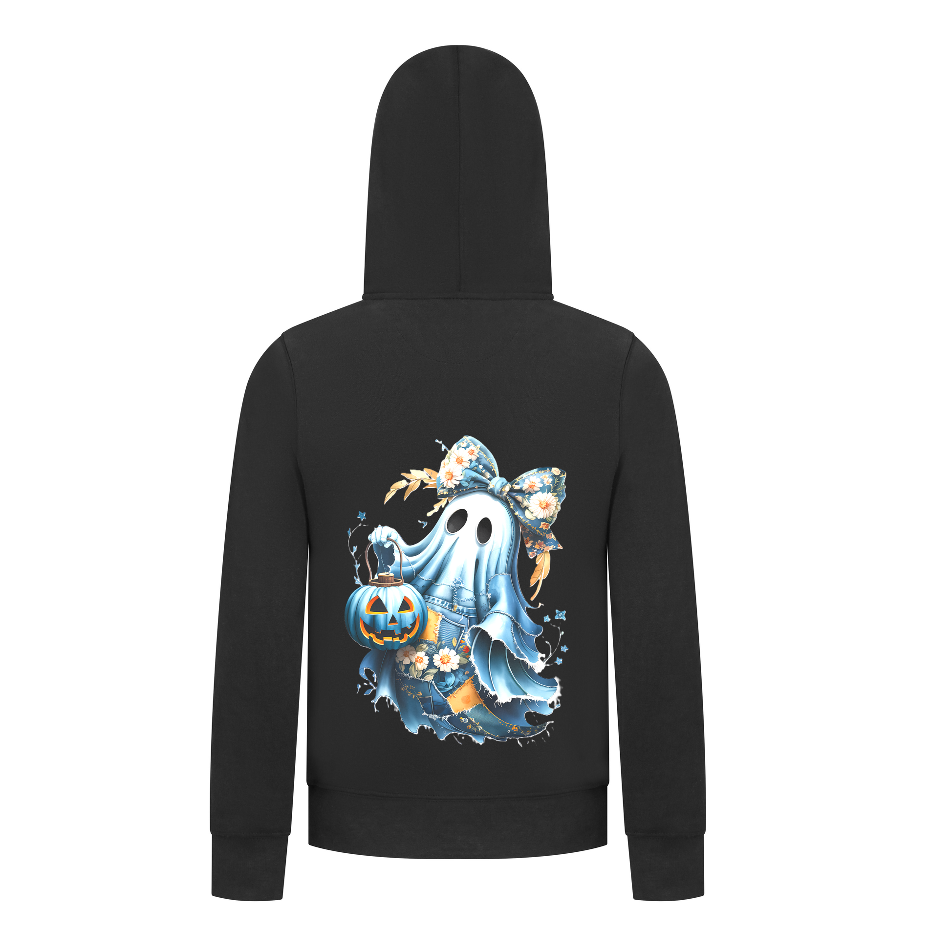 Everyday Kids “Coquette Ghost” Halloween Zip Up Hoodie – Cute Floral Bow Ghost with Pumpkin Lantern – Cozy Fall Sweatshirt for Girls, Black