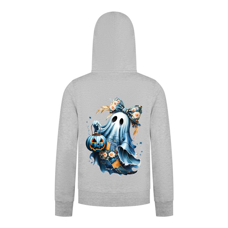 Everyday Kids “Coquette Ghost” Halloween Zip Up Hoodie – Cute Floral Bow Ghost with Pumpkin Lantern – Cozy Fall Sweatshirt for Girls, Heather Gray