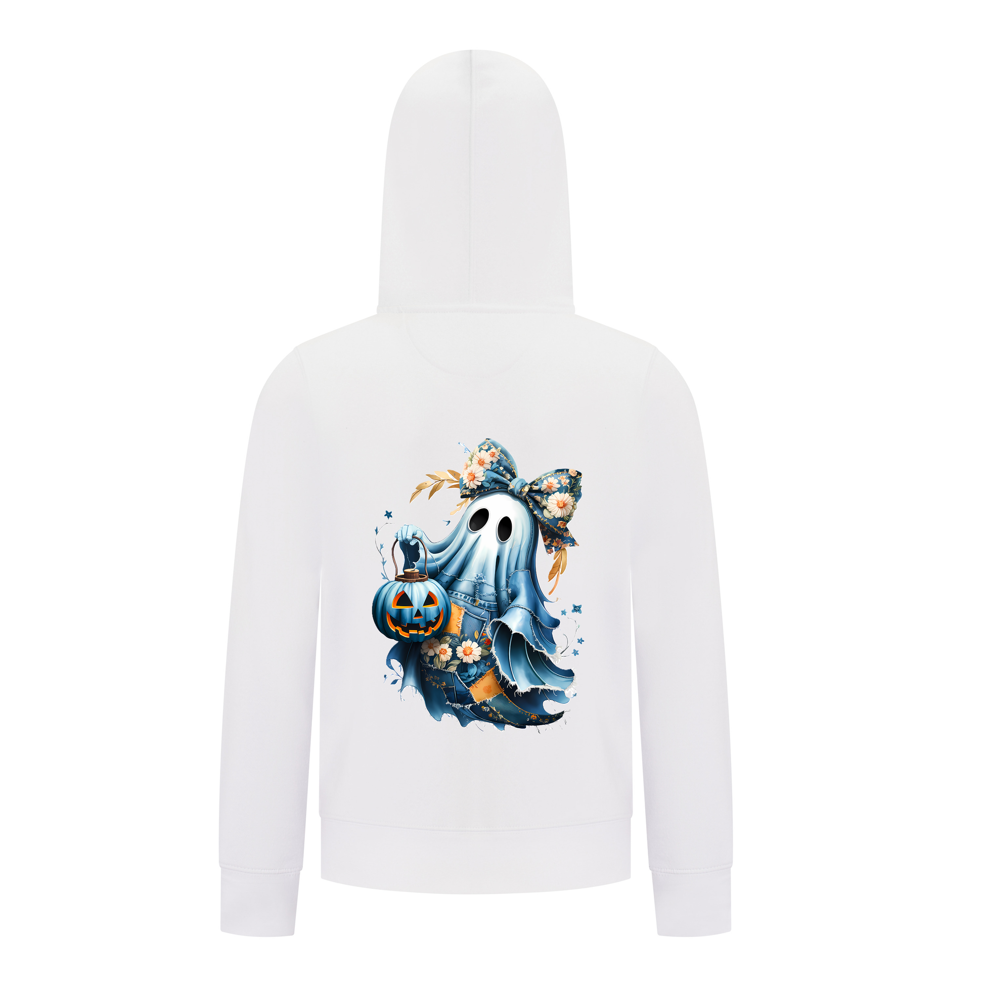 ADORABLY SPOOKY DESIGN – Features a charming ghost in denim-inspired patches with a big floral bow, carrying a glowing pumpkin lantern—perfectly balancing cute and spooky vibes.