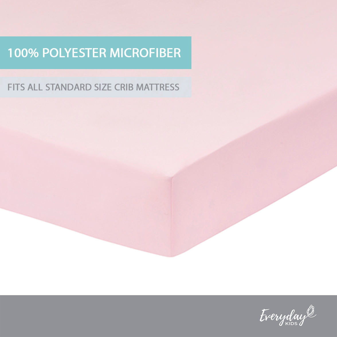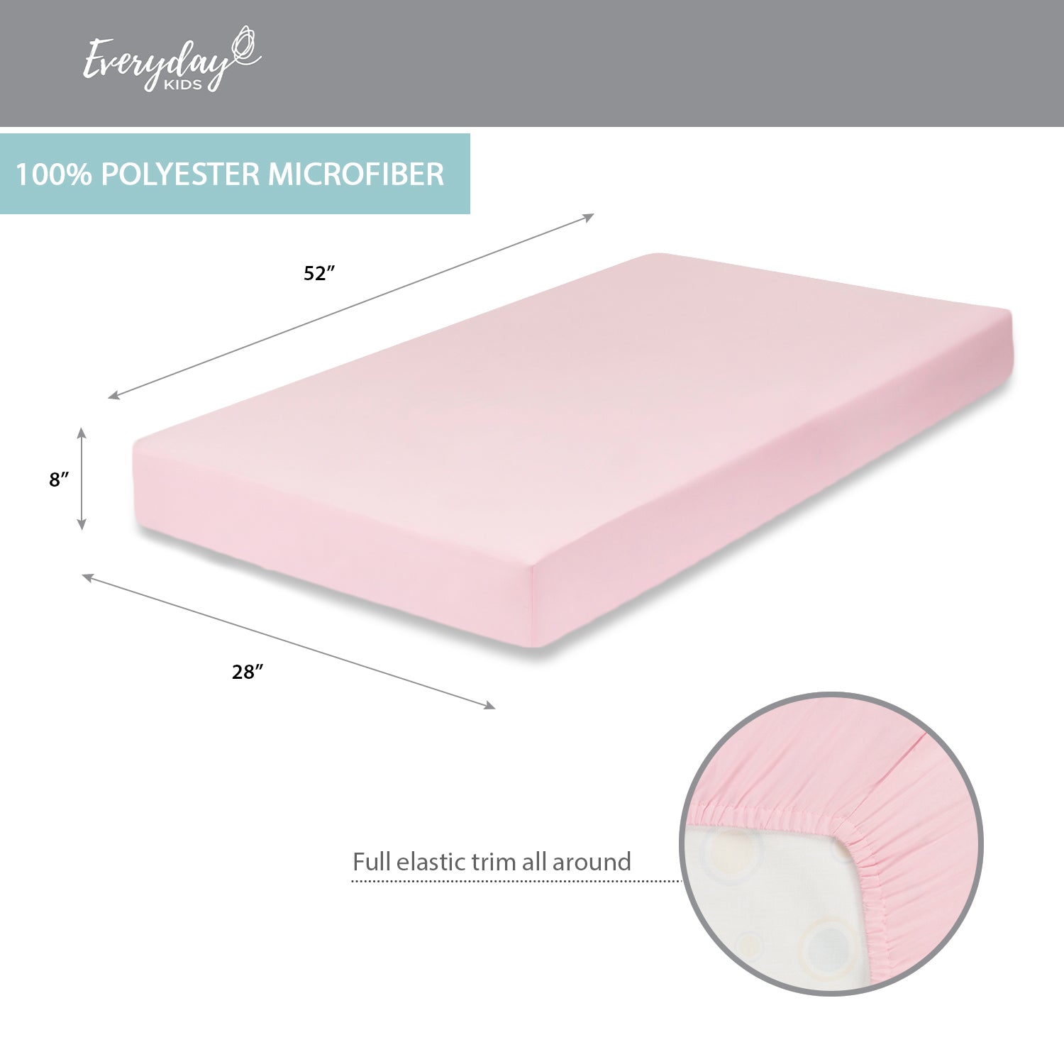 Everyday Kids fitted crib sheet are the perfect match for your nursery. Beautiful colors, soft fabrics and great value make these fitted sheets ideal for any baby's room. Fitted sheet measures 52" by 28". Fits all standard size crib mattresses (28" x 52".). Machine wash separately in cold water with like colors, gentle cycle, use only non-chlorine bleach when needed. Tumble dry low for best results, iron on low heat when needed. Look for coordinated bedding sets from our Everyday Kids bedding collection.