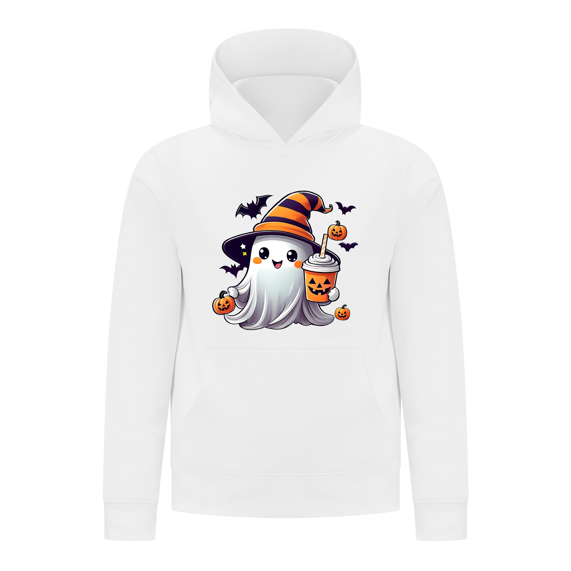 Everyday Kids Halloween Pullover Hoodie – Cute Ghost with Witch Hat and Pumpkin Drink – Cozy Fall Sweatshirt for Girls, White