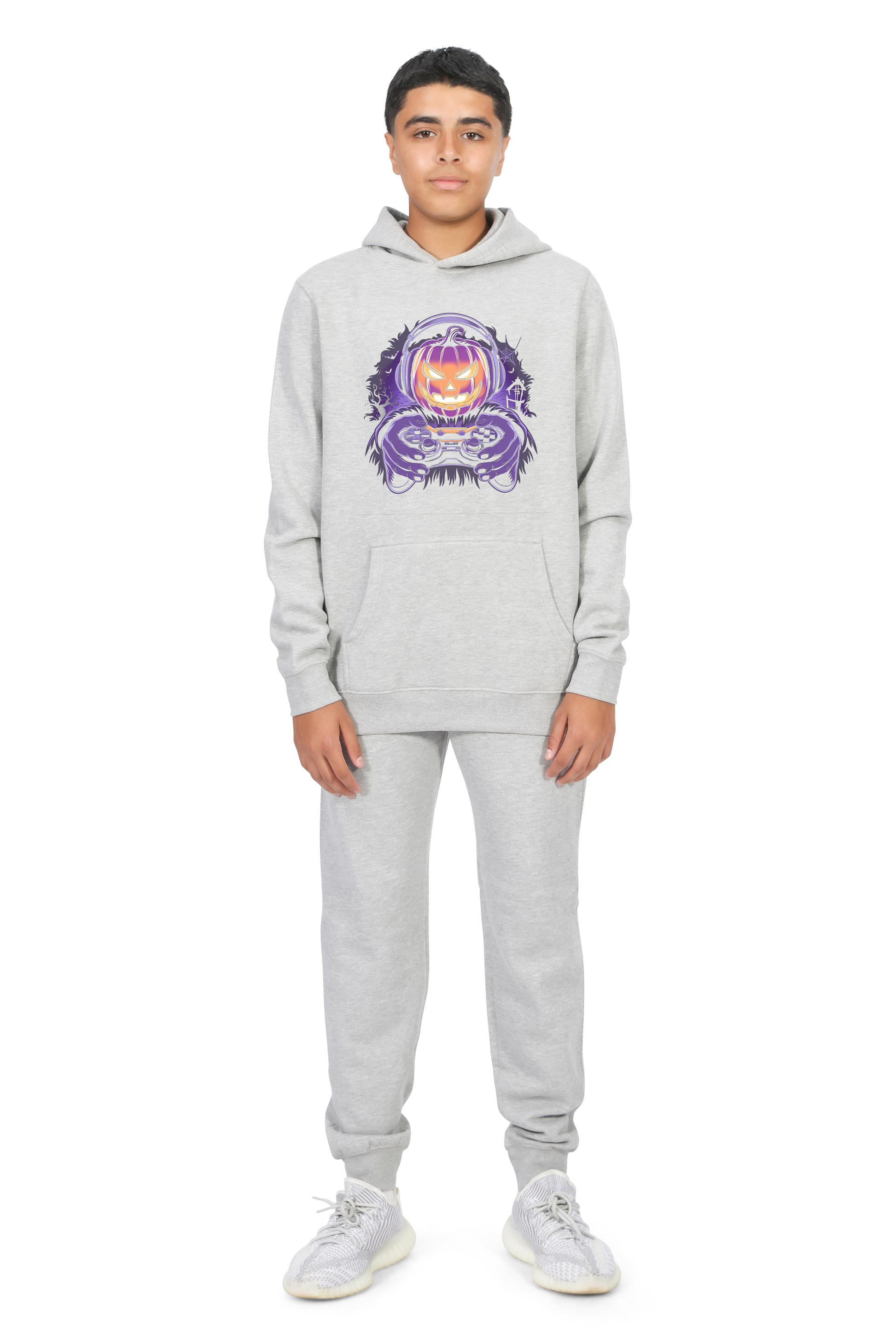 Level up Halloween style with the Everyday Kids Gamer Pumpkin hoodie. Featuring a jack-o’-lantern face in glowing orange and purple tones, complete with headphones and a video game controller, this bold design is perfect for little gamers who love Halloween. Surrounded by haunted house details, bats, and cobwebs, it brings fun and energy to trick-or-treating, school events, and cozy nights at home. Made from soft cotton-blend fleece, this hoodie delivers comfort, warmth, and durability wash after wash.