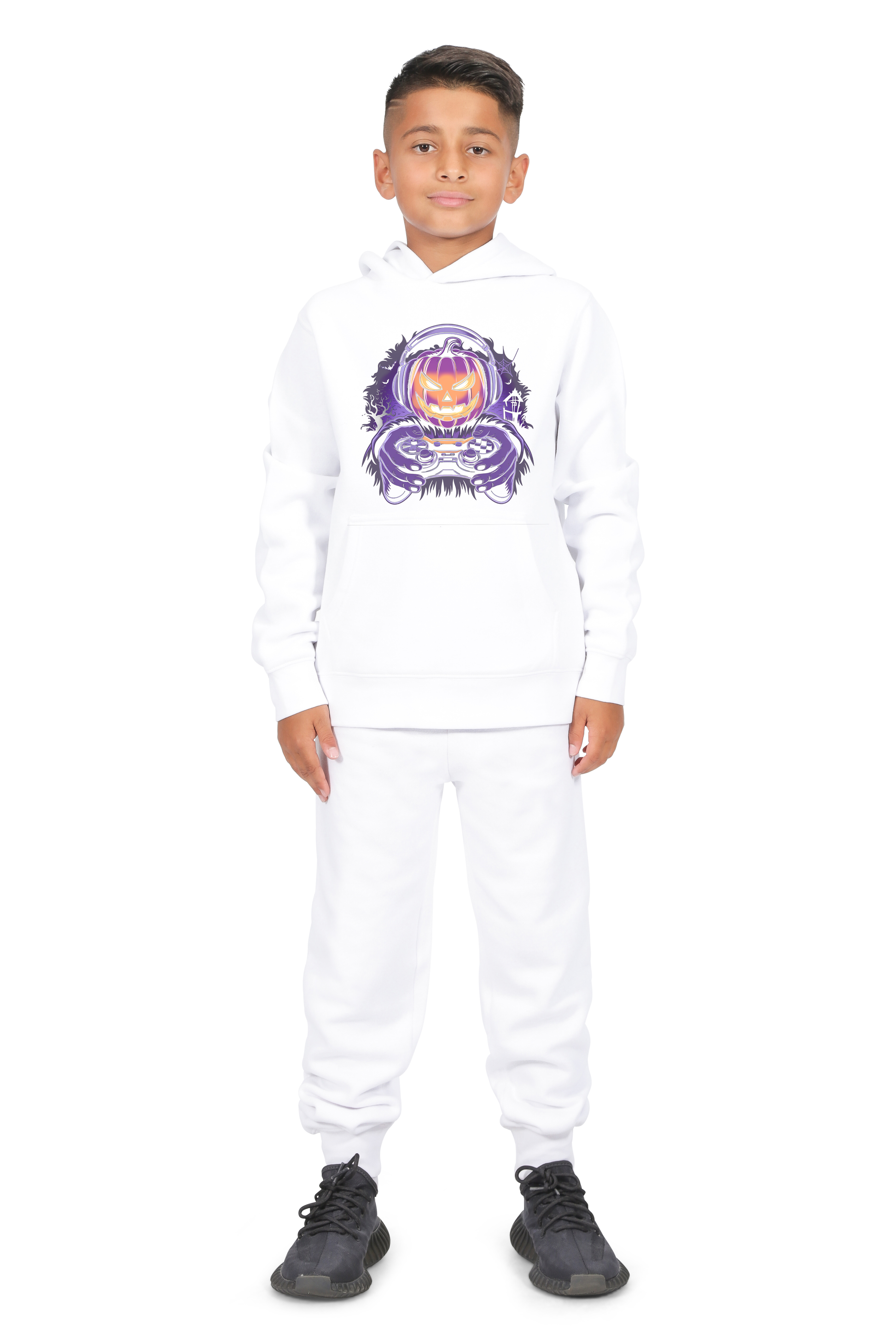 Level up Halloween style with the Everyday Kids Gamer Pumpkin hoodie. Featuring a jack-o’-lantern face in glowing orange and purple tones, complete with headphones and a video game controller, this bold design is perfect for little gamers who love Halloween. Surrounded by haunted house details, bats, and cobwebs, it brings fun and energy to trick-or-treating, school events, and cozy nights at home. Made from soft cotton-blend fleece, this hoodie delivers comfort, warmth, and durability wash after wash.