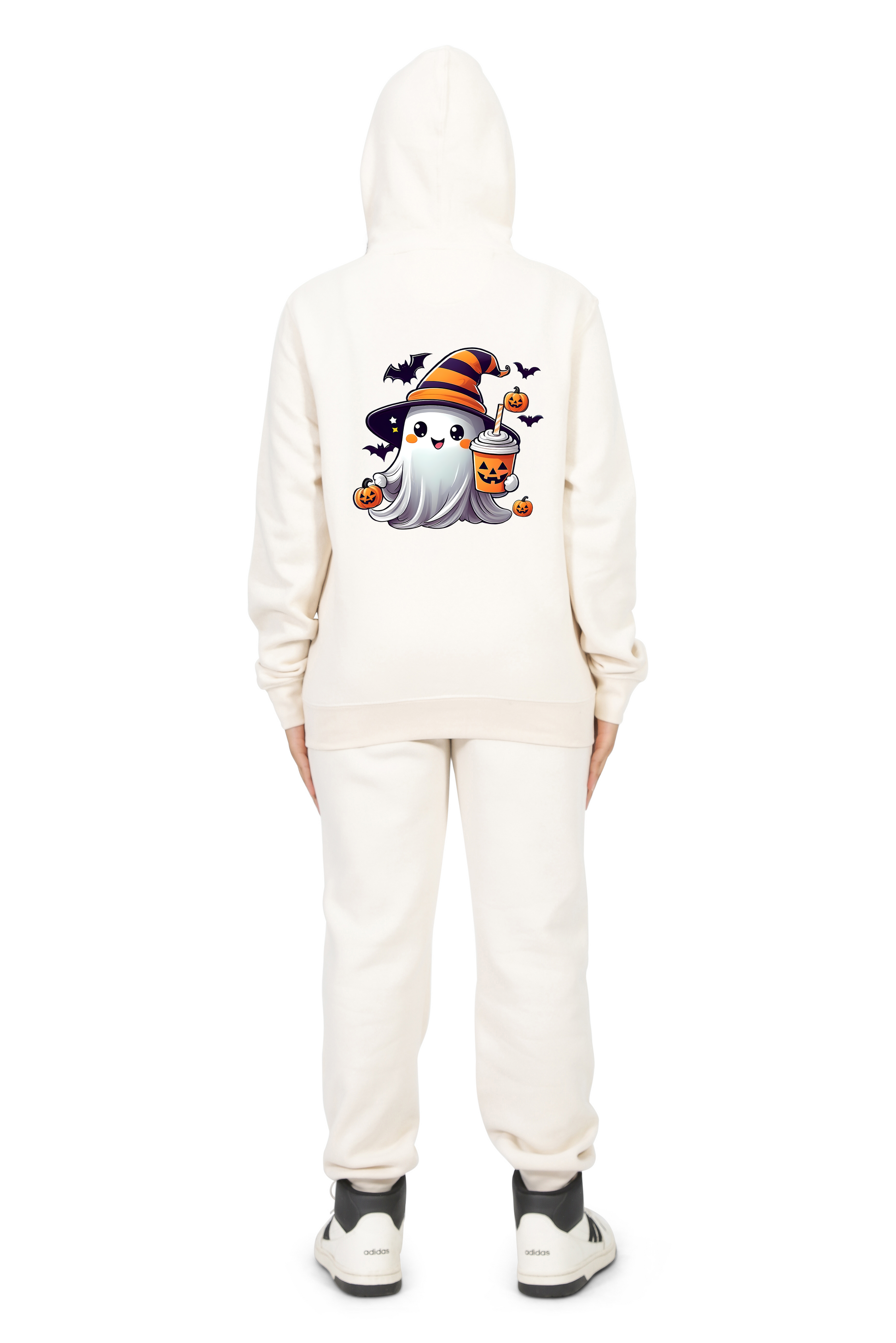 Everyday Kids Halloween Zip Up Hoodie – Cute Ghost with Witch Hat and Pumpkin Drink – Cozy Fall Sweatshirt for Girls, Off-White
