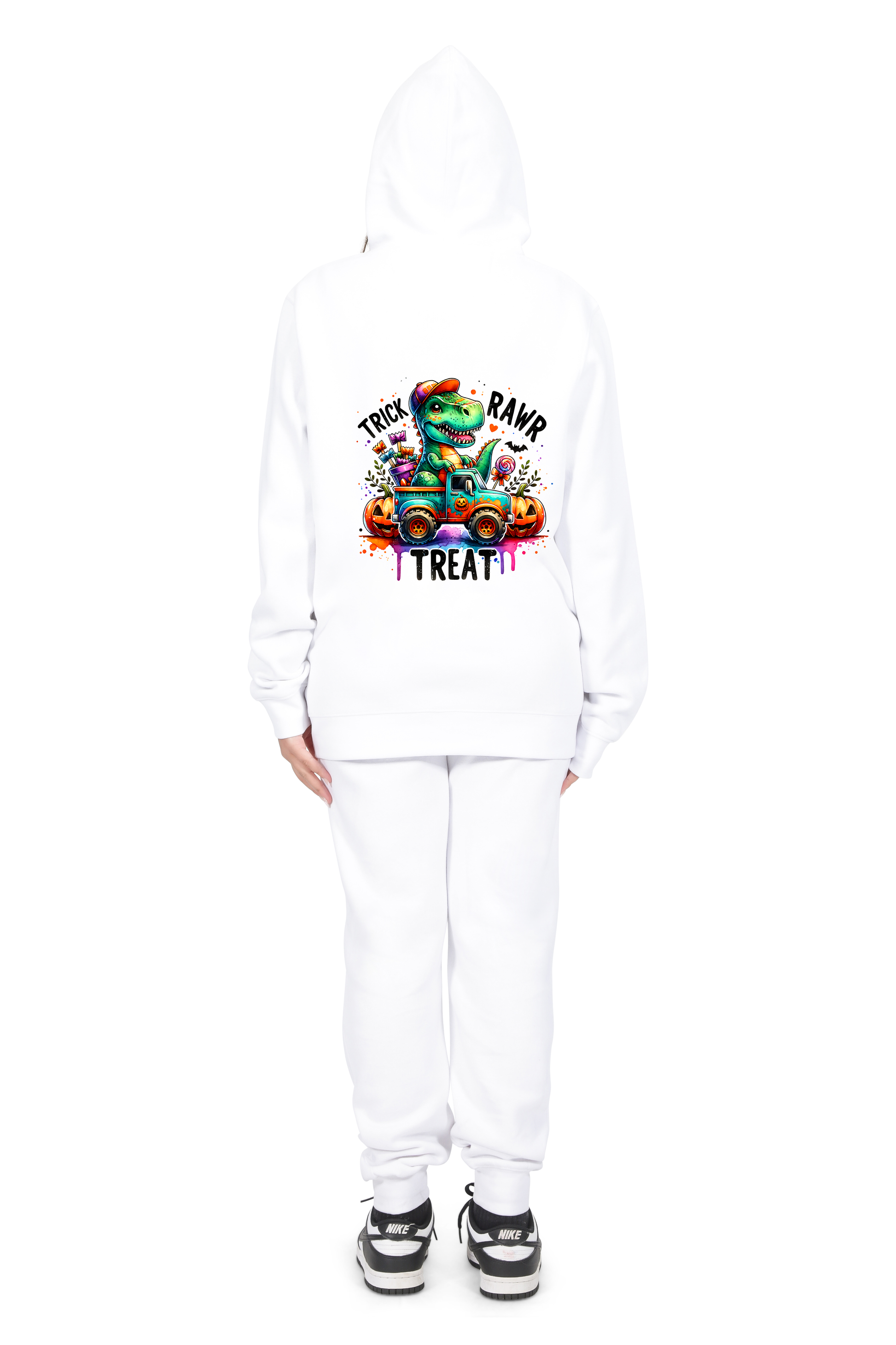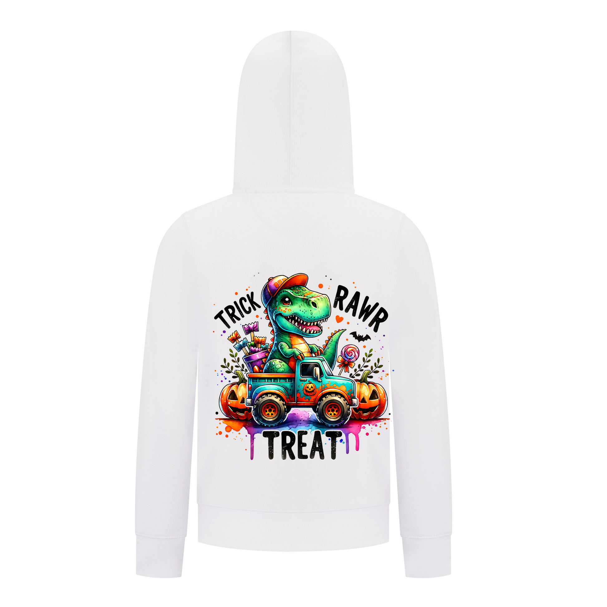 Everyday Kids “Trick RAWR Treat” Dinosaur Halloween Hoodie – Cute T-Rex Truck Graphic with Pumpkins & Candy – Fun Fall Zip-Up Sweatshirt for Boys, White