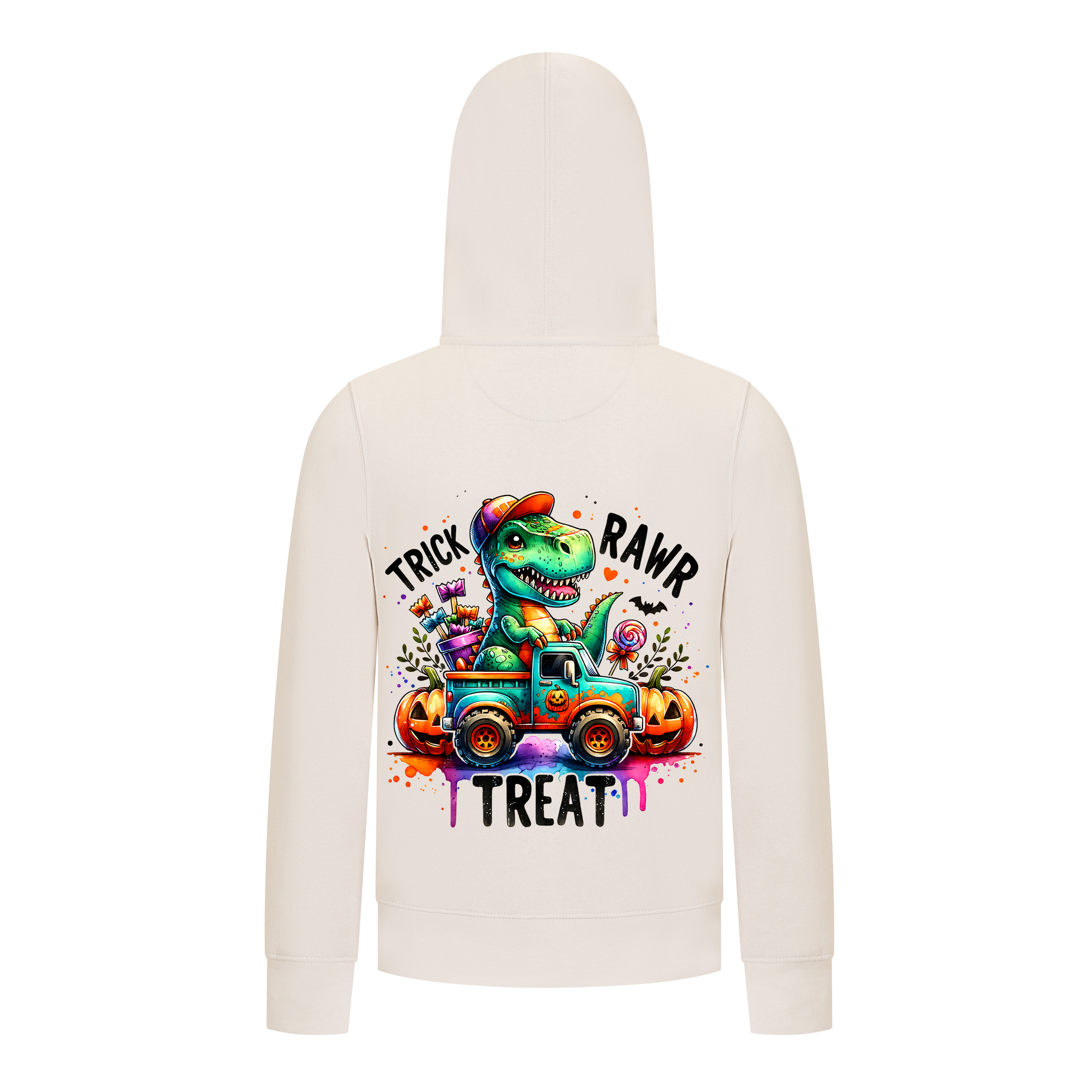 Everyday Kids “Trick RAWR Treat” Dinosaur Halloween Hoodie – Cute T-Rex Truck Graphic with Pumpkins & Candy – Fun Fall ZIp-up Sweatshirt for Boys, Off-White