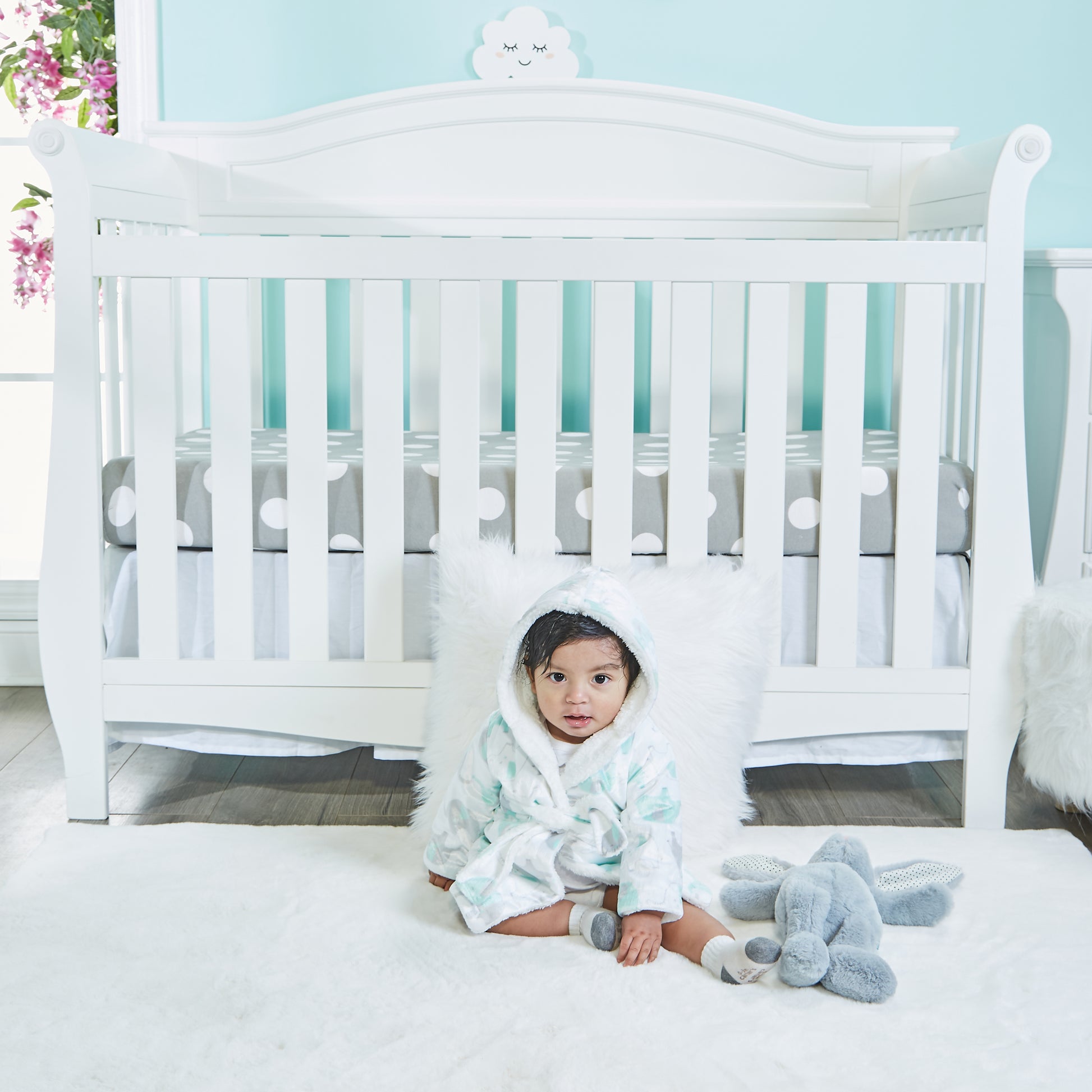 - GENDER NEUTRAL GREEN ELEPHANT ROBE: Choose this white robe featuring green, gray and white elephants as a soothing baby bath essential. The tranquil shade is just the right touch as the day winds down.