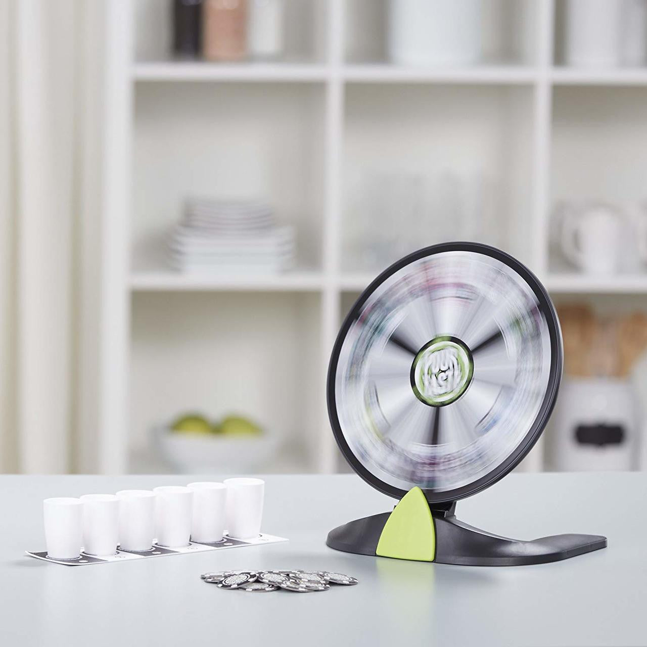- Includes: Wheel with spinner, 6 cups, cup mat, 20 chips, and instructions.