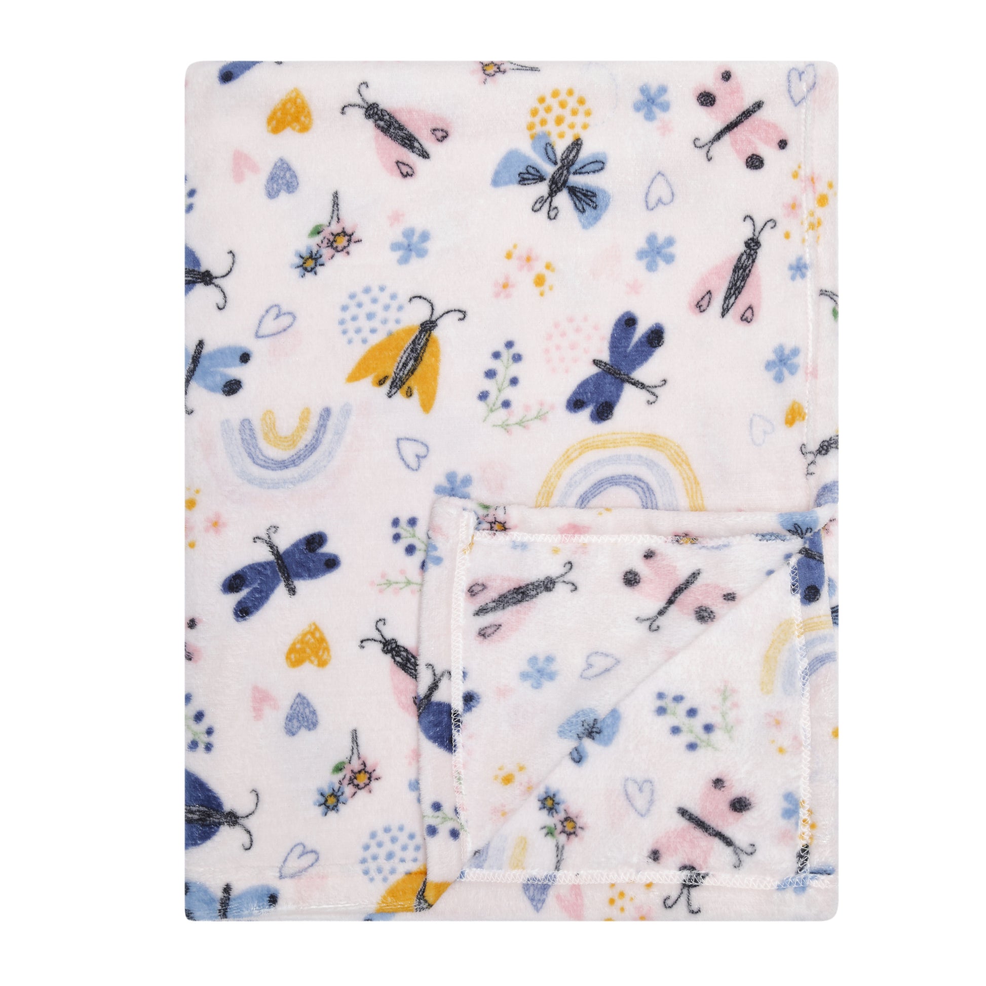 For snuggly comfort, Everyday Kids has your baby covered! Our large ultra soft gold, blue and pink rainbows and butterflies fleece baby blanket is super soft, warm and cozy. This blanket is extra gentle on your baby’s skin and provides a comfy and snuggly place for your baby to sleep. Designed for everyday use, our fleece baby blanket is machine washable and cute for any nursery decor.