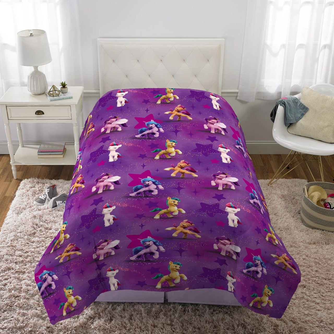 Tuck them into this fun and functional My Little Pony reversible comforter that offers two looks in one. The action-packed design includes vibrant colors for a fun look kids will love. Flip over this soft microfiber comforter and instantly change up the look of their bedroom. This comforter is crafted with high-quality microfiber for a super soft feel and keeping them cozy night after night. This comforter measures 72" x 86" and will fit both a standard twin size bed and full size bed. It is made of 100% polyester microfiber and is machine washable, perfect for busy parents.