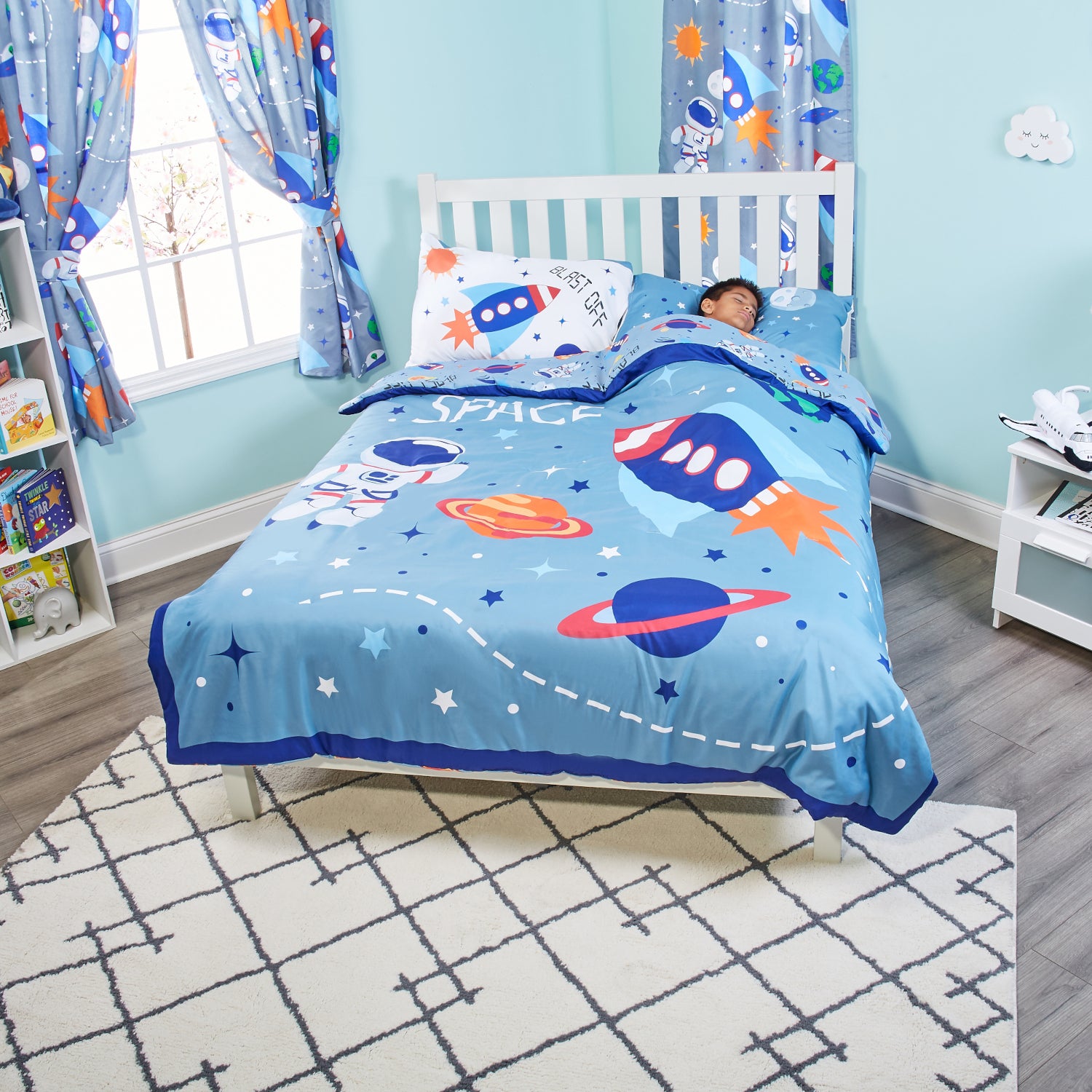Enjoy his delightful reaction, like running to throw his little arms around his big-boy bed comforter when he sees the colorful planets, rocket and astronaut! You’ll love those moments as you read a bedtime story or snuggle as the sun rises! Made of 100% ultra-soft microfiber polyester, this comforter is made to last! The beautiful colors stay bright and the comforter holds its shape, even after multiple washings!
