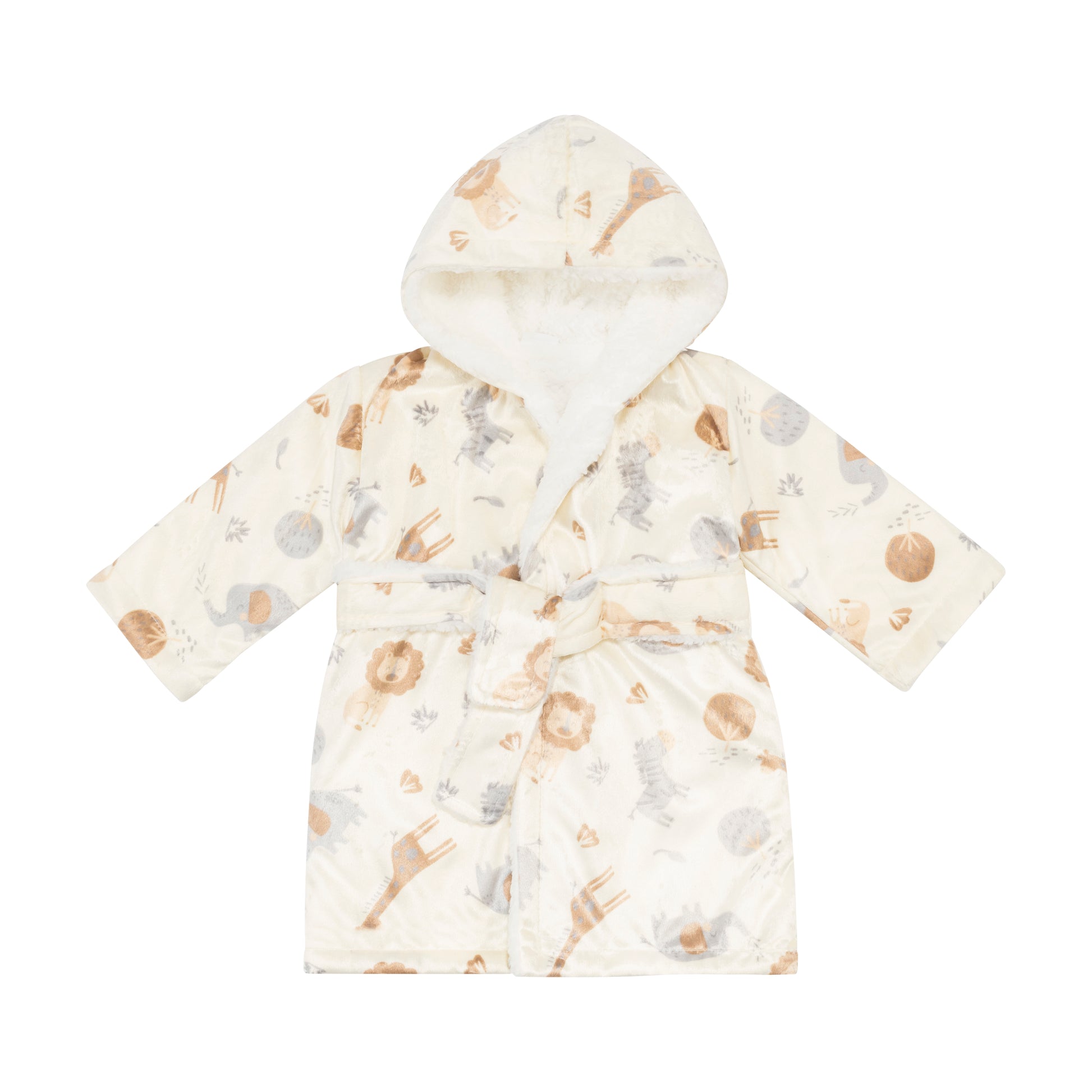 - GENDER NEUTRAL SAFARI THEME ROBE: Choose this beige robe featuring grey elephants and zebras and brown lions and giraffes! It’s a soothing baby bath essential. The tranquil shades of gray and beige are just the right touch as the day winds down.