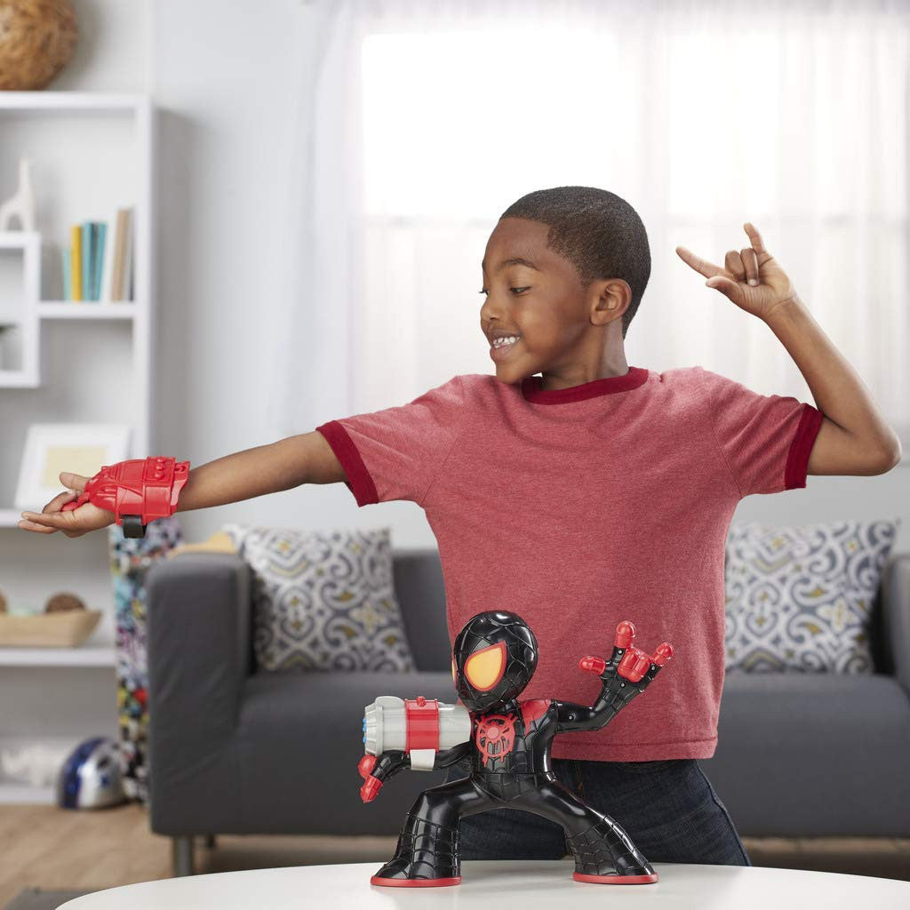- The Spider-Man: into the spider-verse shockstrike Miles Morales Spider-Man electronic figure features light-up eyes and 20 phrases and sound effects!